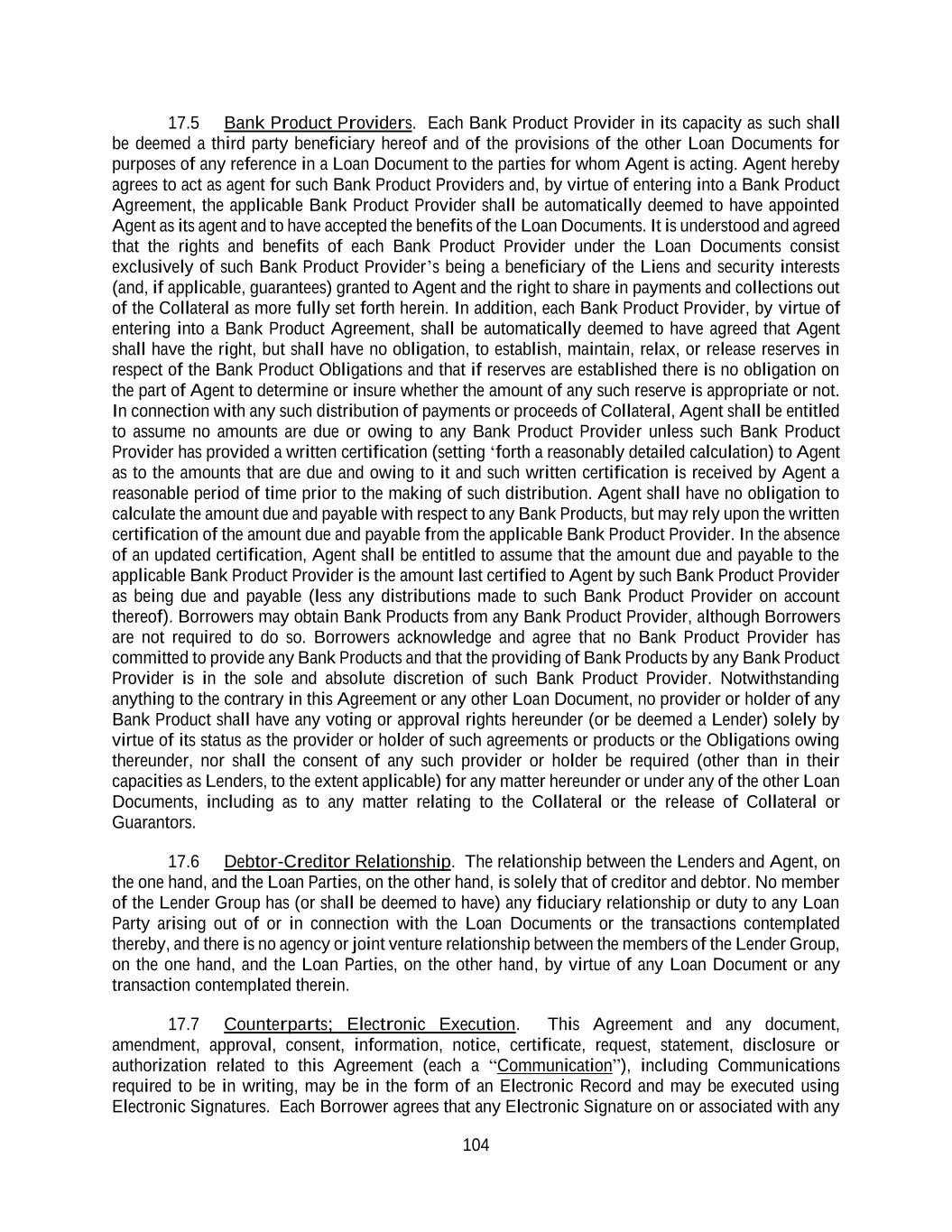104 17.5 Bank Product Providers. Each Bank Product Provider in its capacity as such shall be deemed a third party beneficiary hereof and of the provisions of the other Loan Documents for purposes of any reference in a Loan Document to the parties for whom Agent is acting. Agent hereby agrees to act as agent for such Bank Product Providers and, by virtue of entering into a Bank Product Agreement, the applicable Bank Product Provider shall be automatically deemed to have appointed Agent as its agent and to have accepted the benefits of the Loan Documents. It is understood and agreed that the rights and benefits of each Bank Product Provider under the Loan Documents consist exclusively of such Bank Product Provider’s being a beneficiary of the Liens and security interests (and, if applicable, guarantees) granted to Agent and the right to share in payments and collections out of the Collateral as more fully set forth herein. In addition, each Bank Product Provider, by virtue of entering into a Bank Product Agreement, shall be automatically deemed to have agreed that Agent shall have the right, but shall have no obligation, to establish, maintain, relax, or release reserves in respect of the Bank Product Obligations and that if reserves are established there is no obligation on the part of Agent to determine or insure whether the amount of any such reserve is appropriate or not. In connection with any such distribution of payments or proceeds of Collateral, Agent shall be entitled to assume no amounts are due or owing to any Bank Product Provider unless such Bank Product Provider has provided a written certification (setting ‘forth a reasonably detailed calculation) to Agent as to the amounts that are due and owing to it and such written certification is received by Agent a reasonable period of time prior to the making of such distribution. Agent shall have no obligation to calculate the amount due and payable with respect to any Bank Products, but may rely upon the written certification of the amount due and payable from the applicable Bank Product Provider. In the absence of an updated certification, Agent shall be entitled to assume that the amount due and payable to the applicable Bank Product Provider is the amount last certified to Agent by such Bank Product Provider as being due and payable (less any distributions made to such Bank Product Provider on account thereof). Borrowers may obtain Bank Products from any Bank Product Provider, although Borrowers are not required to do so. Borrowers acknowledge and agree that no Bank Product Provider has committed to provide any Bank Products and that the providing of Bank Products by any Bank Product Provider is in the sole and absolute discretion of such Bank Product Provider. Notwithstanding anything to the contrary in this Agreement or any other Loan Document, no provider or holder of any Bank Product shall have any voting or approval rights hereunder (or be deemed a Lender) solely by virtue of its status as the provider or holder of such agreements or products or the Obligations owing thereunder, nor shall the consent of any such provider or holder be required (other than in their capacities as Lenders, to the extent applicable) for any matter hereunder or under any of the other Loan Documents, including as to any matter relating to the Collateral or the release of Collateral or Guarantors. 17.6 Debtor-Creditor Relationship. The relationship between the Lenders and Agent, on the one hand, and the Loan Parties, on the other hand, is solely that of creditor and debtor. No member of the Lender Group has (or shall be deemed to have) any fiduciary relationship or duty to any Loan Party arising out of or in connection with the Loan Documents or the transactions contemplated thereby, and there is no agency or joint venture relationship between the members of the Lender Group, on the one hand, and the Loan Parties, on the other hand, by virtue of any Loan Document or any transaction contemplated therein. 17.7 Counterparts; Electronic Execution. This Agreement and any document, amendment, approval, consent, information, notice, certificate, request, statement, disclosure or authorization related to this Agreement (each a “Communication”), including Communications required to be in writing, may be in the form of an Electronic Record and may be executed using Electronic Signatures. Each Borrower agrees that any Electronic Signature on or associated with any