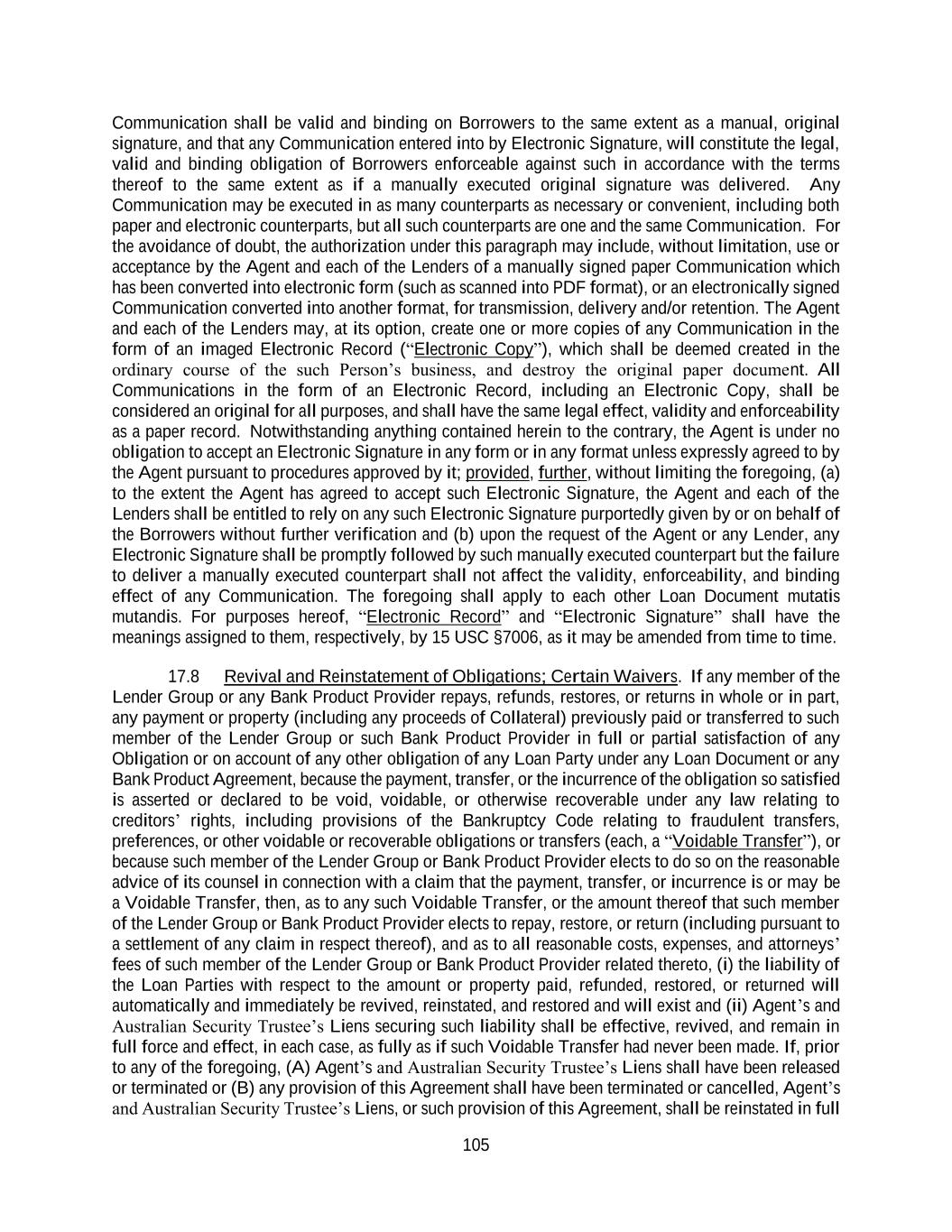 105 Communication shall be valid and binding on Borrowers to the same extent as a manual, original signature, and that any Communication entered into by Electronic Signature, will constitute the legal, valid and binding obligation of Borrowers enforceable against such in accordance with the terms thereof to the same extent as if a manually executed original signature was delivered. Any Communication may be executed in as many counterparts as necessary or convenient, including both paper and electronic counterparts, but all such counterparts are one and the same Communication. For the avoidance of doubt, the authorization under this paragraph may include, without limitation, use or acceptance by the Agent and each of the Lenders of a manually signed paper Communication which has been converted into electronic form (such as scanned into PDF format), or an electronically signed Communication converted into another format, for transmission, delivery and/or retention. The Agent and each of the Lenders may, at its option, create one or more copies of any Communication in the form of an imaged Electronic Record (“Electronic Copy”), which shall be deemed created in the ordinary course of the such Person’s business, and destroy the original paper document. All Communications in the form of an Electronic Record, including an Electronic Copy, shall be considered an original for all purposes, and shall have the same legal effect, validity and enforceability as a paper record. Notwithstanding anything contained herein to the contrary, the Agent is under no obligation to accept an Electronic Signature in any form or in any format unless expressly agreed to by the Agent pursuant to procedures approved by it; provided, further, without limiting the foregoing, (a) to the extent the Agent has agreed to accept such Electronic Signature, the Agent and each of the Lenders shall be entitled to rely on any such Electronic Signature purportedly given by or on behalf of the Borrowers without further verification and (b) upon the request of the Agent or any Lender, any Electronic Signature shall be promptly followed by such manually executed counterpart but the failure to deliver a manually executed counterpart shall not affect the validity, enforceability, and binding effect of any Communication. The foregoing shall apply to each other Loan Document mutatis mutandis. For purposes hereof, “Electronic Record” and “Electronic Signature” shall have the meanings assigned to them, respectively, by 15 USC §7006, as it may be amended from time to time. 17.8 Revival and Reinstatement of Obligations; Certain Waivers. If any member of the Lender Group or any Bank Product Provider repays, refunds, restores, or returns in whole or in part, any payment or property (including any proceeds of Collateral) previously paid or transferred to such member of the Lender Group or such Bank Product Provider in full or partial satisfaction of any Obligation or on account of any other obligation of any Loan Party under any Loan Document or any Bank Product Agreement, because the payment, transfer, or the incurrence of the obligation so satisfied is asserted or declared to be void, voidable, or otherwise recoverable under any law relating to creditors’ rights, including provisions of the Bankruptcy Code relating to fraudulent transfers, preferences, or other voidable or recoverable obligations or transfers (each, a “Voidable Transfer”), or because such member of the Lender Group or Bank Product Provider elects to do so on the reasonable advice of its counsel in connection with a claim that the payment, transfer, or incurrence is or may be a Voidable Transfer, then, as to any such Voidable Transfer, or the amount thereof that such member of the Lender Group or Bank Product Provider elects to repay, restore, or return (including pursuant to a settlement of any claim in respect thereof), and as to all reasonable costs, expenses, and attorneys’ fees of such member of the Lender Group or Bank Product Provider related thereto, (i) the liability of the Loan Parties with respect to the amount or property paid, refunded, restored, or returned will automatically and immediately be revived, reinstated, and restored and will exist and (ii) Agent’s and Australian Security Trustee’s Liens securing such liability shall be effective, revived, and remain in full force and effect, in each case, as fully as if such Voidable Transfer had never been made. If, prior to any of the foregoing, (A) Agent’s and Australian Security Trustee’s Liens shall have been released or terminated or (B) any provision of this Agreement shall have been terminated or cancelled, Agent’s and Australian Security Trustee’s Liens, or such provision of this Agreement, shall be reinstated in full