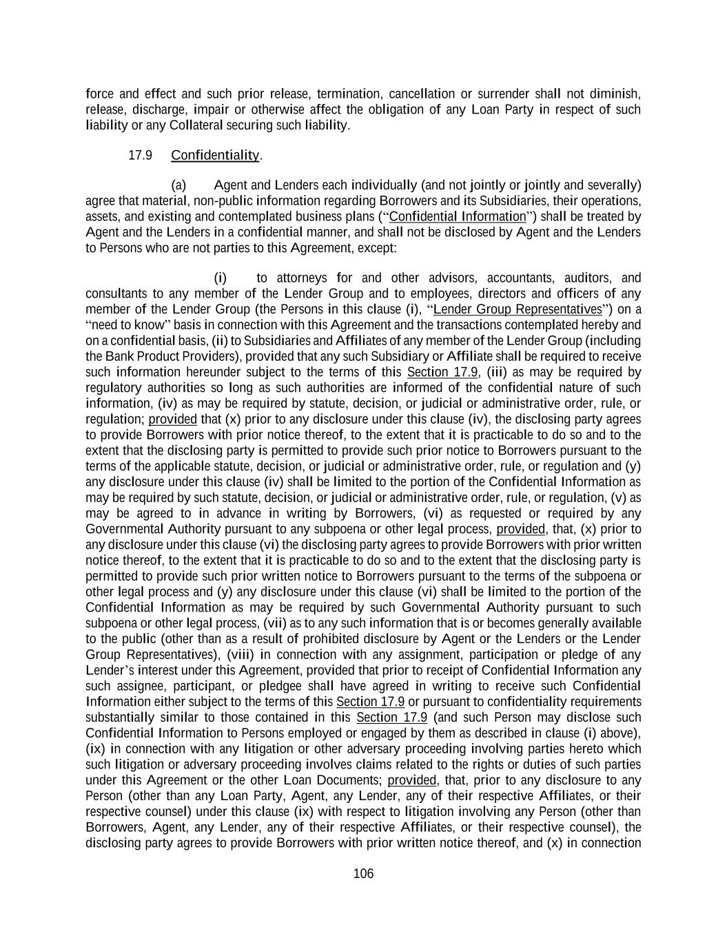 106 force and effect and such prior release, termination, cancellation or surrender shall not diminish, release, discharge, impair or otherwise affect the obligation of any Loan Party in respect of such liability or any Collateral securing such liability. 17.9 Confidentiality. (a) Agent and Lenders each individually (and not jointly or jointly and severally) agree that material, non-public information regarding Borrowers and its Subsidiaries, their operations, assets, and existing and contemplated business plans (“Confidential Information”) shall be treated by Agent and the Lenders in a confidential manner, and shall not be disclosed by Agent and the Lenders to Persons who are not parties to this Agreement, except: (i) to attorneys for and other advisors, accountants, auditors, and consultants to any member of the Lender Group and to employees, directors and officers of any member of the Lender Group (the Persons in this clause (i), “Lender Group Representatives”) on a “need to know” basis in connection with this Agreement and the transactions contemplated hereby and on a confidential basis, (ii) to Subsidiaries and Affiliates of any member of the Lender Group (including the Bank Product Providers), provided that any such Subsidiary or Affiliate shall be required to receive such information hereunder subject to the terms of this Section 17.9, (iii) as may be required by regulatory authorities so long as such authorities are informed of the confidential nature of such information, (iv) as may be required by statute, decision, or judicial or administrative order, rule, or regulation; provided that (x) prior to any disclosure under this clause (iv), the disclosing party agrees to provide Borrowers with prior notice thereof, to the extent that it is practicable to do so and to the extent that the disclosing party is permitted to provide such prior notice to Borrowers pursuant to the terms of the applicable statute, decision, or judicial or administrative order, rule, or regulation and (y) any disclosure under this clause (iv) shall be limited to the portion of the Confidential Information as may be required by such statute, decision, or judicial or administrative order, rule, or regulation, (v) as may be agreed to in advance in writing by Borrowers, (vi) as requested or required by any Governmental Authority pursuant to any subpoena or other legal process, provided, that, (x) prior to any disclosure under this clause (vi) the disclosing party agrees to provide Borrowers with prior written notice thereof, to the extent that it is practicable to do so and to the extent that the disclosing party is permitted to provide such prior written notice to Borrowers pursuant to the terms of the subpoena or other legal process and (y) any disclosure under this clause (vi) shall be limited to the portion of the Confidential Information as may be required by such Governmental Authority pursuant to such subpoena or other legal process, (vii) as to any such information that is or becomes generally available to the public (other than as a result of prohibited disclosure by Agent or the Lenders or the Lender Group Representatives), (viii) in connection with any assignment, participation or pledge of any Lender’s interest under this Agreement, provided that prior to receipt of Confidential Information any such assignee, participant, or pledgee shall have agreed in writing to receive such Confidential Information either subject to the terms of this Section 17.9 or pursuant to confidentiality requirements substantially similar to those contained in this Section 17.9 (and such Person may disclose such Confidential Information to Persons employed or engaged by them as described in clause (i) above), (ix) in connection with any litigation or other adversary proceeding involving parties hereto which such litigation or adversary proceeding involves claims related to the rights or duties of such parties under this Agreement or the other Loan Documents; provided, that, prior to any disclosure to any Person (other than any Loan Party, Agent, any Lender, any of their respective Affiliates, or their respective counsel) under this clause (ix) with respect to litigation involving any Person (other than Borrowers, Agent, any Lender, any of their respective Affiliates, or their respective counsel), the disclosing party agrees to provide Borrowers with prior written notice thereof, and (x) in connection