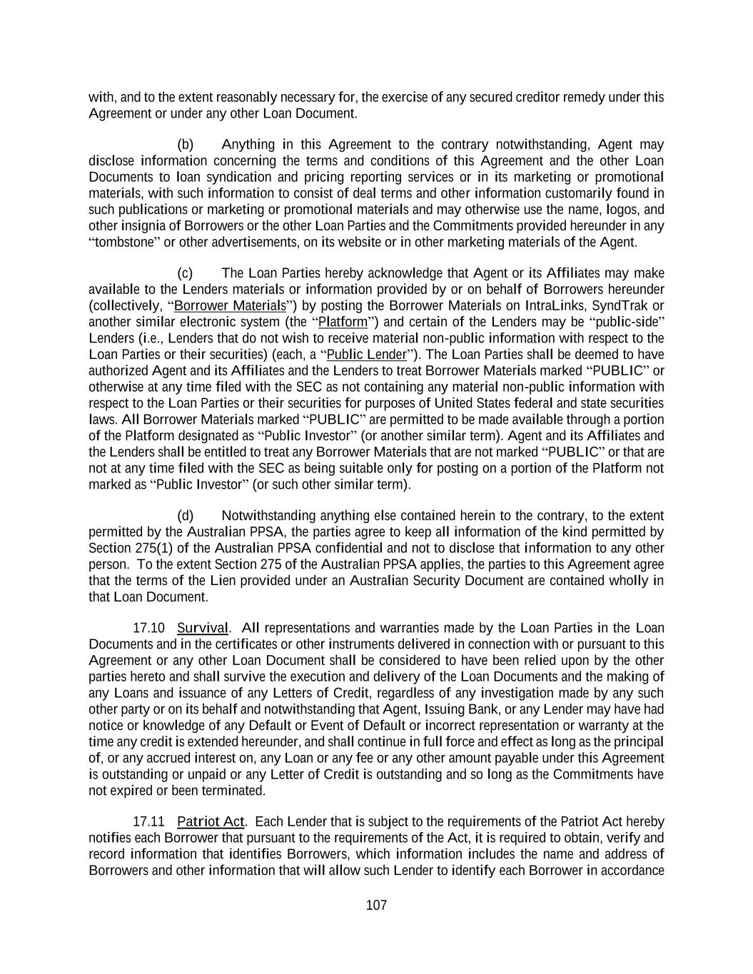 107 with, and to the extent reasonably necessary for, the exercise of any secured creditor remedy under this Agreement or under any other Loan Document. (b) Anything in this Agreement to the contrary notwithstanding, Agent may disclose information concerning the terms and conditions of this Agreement and the other Loan Documents to loan syndication and pricing reporting services or in its marketing or promotional materials, with such information to consist of deal terms and other information customarily found in such publications or marketing or promotional materials and may otherwise use the name, logos, and other insignia of Borrowers or the other Loan Parties and the Commitments provided hereunder in any “tombstone” or other advertisements, on its website or in other marketing materials of the Agent. (c) The Loan Parties hereby acknowledge that Agent or its Affiliates may make available to the Lenders materials or information provided by or on behalf of Borrowers hereunder (collectively, “Borrower Materials”) by posting the Borrower Materials on IntraLinks, SyndTrak or another similar electronic system (the “Platform”) and certain of the Lenders may be “public-side” Lenders (i.e., Lenders that do not wish to receive material non-public information with respect to the Loan Parties or their securities) (each, a “Public Lender”). The Loan Parties shall be deemed to have authorized Agent and its Affiliates and the Lenders to treat Borrower Materials marked “PUBLIC” or otherwise at any time filed with the SEC as not containing any material non-public information with respect to the Loan Parties or their securities for purposes of United States federal and state securities laws. All Borrower Materials marked “PUBLIC” are permitted to be made available through a portion of the Platform designated as “Public Investor” (or another similar term). Agent and its Affiliates and the Lenders shall be entitled to treat any Borrower Materials that are not marked “PUBLIC” or that are not at any time filed with the SEC as being suitable only for posting on a portion of the Platform not marked as “Public Investor” (or such other similar term). (d) Notwithstanding anything else contained herein to the contrary, to the extent permitted by the Australian PPSA, the parties agree to keep all information of the kind permitted by Section 275(1) of the Australian PPSA confidential and not to disclose that information to any other person. To the extent Section 275 of the Australian PPSA applies, the parties to this Agreement agree that the terms of the Lien provided under an Australian Security Document are contained wholly in that Loan Document. 17.10 Survival. All representations and warranties made by the Loan Parties in the Loan Documents and in the certificates or other instruments delivered in connection with or pursuant to this Agreement or any other Loan Document shall be considered to have been relied upon by the other parties hereto and shall survive the execution and delivery of the Loan Documents and the making of any Loans and issuance of any Letters of Credit, regardless of any investigation made by any such other party or on its behalf and notwithstanding that Agent, Issuing Bank, or any Lender may have had notice or knowledge of any Default or Event of Default or incorrect representation or warranty at the time any credit is extended hereunder, and shall continue in full force and effect as long as the principal of, or any accrued interest on, any Loan or any fee or any other amount payable under this Agreement is outstanding or unpaid or any Letter of Credit is outstanding and so long as the Commitments have not expired or been terminated. 17.11 Patriot Act. Each Lender that is subject to the requirements of the Patriot Act hereby notifies each Borrower that pursuant to the requirements of the Act, it is required to obtain, verify and record information that identifies Borrowers, which information includes the name and address of Borrowers and other information that will allow such Lender to identify each Borrower in accordance