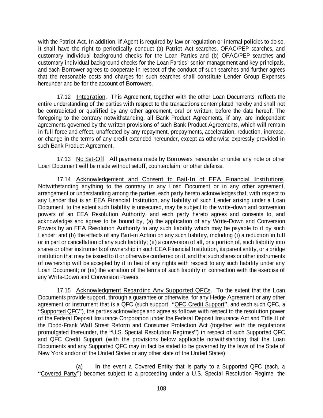 108 with the Patriot Act. In addition, if Agent is required by law or regulation or internal policies to do so, it shall have the right to periodically conduct (a) Patriot Act searches, OFAC/PEP searches, and customary individual background checks for the Loan Parties and (b) OFAC/PEP searches and customary individual background checks for the Loan Parties’ senior management and key principals, and each Borrower agrees to cooperate in respect of the conduct of such searches and further agrees that the reasonable costs and charges for such searches shall constitute Lender Group Expenses hereunder and be for the account of Borrowers. 17.12 Integration. This Agreement, together with the other Loan Documents, reflects the entire understanding of the parties with respect to the transactions contemplated hereby and shall not be contradicted or qualified by any other agreement, oral or written, before the date hereof. The foregoing to the contrary notwithstanding, all Bank Product Agreements, if any, are independent agreements governed by the written provisions of such Bank Product Agreements, which will remain in full force and effect, unaffected by any repayment, prepayments, acceleration, reduction, increase, or change in the terms of any credit extended hereunder, except as otherwise expressly provided in such Bank Product Agreement. 17.13 No Set-Off. All payments made by Borrowers hereunder or under any note or other Loan Document will be made without setoff, counterclaim, or other defense. 17.14 Acknowledgement and Consent to Bail-In of EEA Financial Institutions. Notwithstanding anything to the contrary in any Loan Document or in any other agreement, arrangement or understanding among the parties, each party hereto acknowledges that, with respect to any Lender that is an EEA Financial Institution, any liability of such Lender arising under a Loan Document, to the extent such liability is unsecured, may be subject to the write-down and conversion powers of an EEA Resolution Authority, and each party hereto agrees and consents to, and acknowledges and agrees to be bound by, (a) the application of any Write-Down and Conversion Powers by an EEA Resolution Authority to any such liability which may be payable to it by such Lender; and (b) the effects of any Bail-in Action on any such liability, including (i) a reduction in full or in part or cancellation of any such liability; (ii) a conversion of all, or a portion of, such liability into shares or other instruments of ownership in such EEA Financial Institution, its parent entity, or a bridge institution that may be issued to it or otherwise conferred on it, and that such shares or other instruments of ownership will be accepted by it in lieu of any rights with respect to any such liability under any Loan Document; or (iii) the variation of the terms of such liability in connection with the exercise of any Write-Down and Conversion Powers. 17.15 Acknowledgment Regarding Any Supported QFCs. To the extent that the Loan Documents provide support, through a guarantee or otherwise, for any Hedge Agreement or any other agreement or instrument that is a QFC (such support, “QFC Credit Support”, and each such QFC, a “Supported QFC”), the parties acknowledge and agree as follows with respect to the resolution power of the Federal Deposit Insurance Corporation under the Federal Deposit Insurance Act and Title II of the Dodd-Frank Wall Street Reform and Consumer Protection Act (together with the regulations promulgated thereunder, the “U.S. Special Resolution Regimes”) in respect of such Supported QFC and QFC Credit Support (with the provisions below applicable notwithstanding that the Loan Documents and any Supported QFC may in fact be stated to be governed by the laws of the State of New York and/or of the United States or any other state of the United States): (a) In the event a Covered Entity that is party to a Supported QFC (each, a “Covered Party”) becomes subject to a proceeding under a U.S. Special Resolution Regime, the