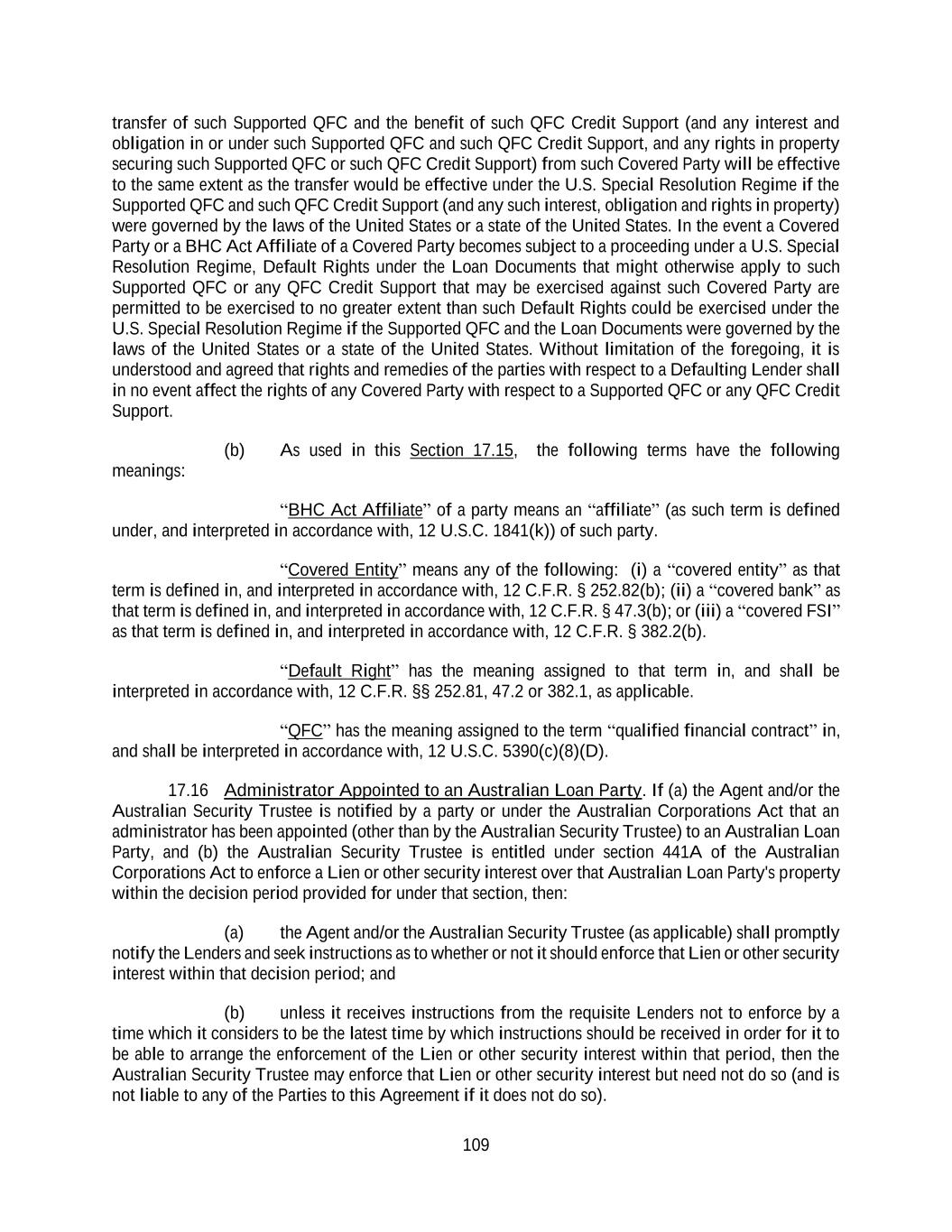 109 transfer of such Supported QFC and the benefit of such QFC Credit Support (and any interest and obligation in or under such Supported QFC and such QFC Credit Support, and any rights in property securing such Supported QFC or such QFC Credit Support) from such Covered Party will be effective to the same extent as the transfer would be effective under the U.S. Special Resolution Regime if the Supported QFC and such QFC Credit Support (and any such interest, obligation and rights in property) were governed by the laws of the United States or a state of the United States. In the event a Covered Party or a BHC Act Affiliate of a Covered Party becomes subject to a proceeding under a U.S. Special Resolution Regime, Default Rights under the Loan Documents that might otherwise apply to such Supported QFC or any QFC Credit Support that may be exercised against such Covered Party are permitted to be exercised to no greater extent than such Default Rights could be exercised under the U.S. Special Resolution Regime if the Supported QFC and the Loan Documents were governed by the laws of the United States or a state of the United States. Without limitation of the foregoing, it is understood and agreed that rights and remedies of the parties with respect to a Defaulting Lender shall in no event affect the rights of any Covered Party with respect to a Supported QFC or any QFC Credit Support. (b) As used in this Section 17.15, the following terms have the following meanings: “BHC Act Affiliate” of a party means an “affiliate” (as such term is defined under, and interpreted in accordance with, 12 U.S.C. 1841(k)) of such party. “Covered Entity” means any of the following: (i) a “covered entity” as that term is defined in, and interpreted in accordance with, 12 C.F.R. § 252.82(b); (ii) a “covered bank” as that term is defined in, and interpreted in accordance with, 12 C.F.R. § 47.3(b); or (iii) a “covered FSI” as that term is defined in, and interpreted in accordance with, 12 C.F.R. § 382.2(b). “Default Right” has the meaning assigned to that term in, and shall be interpreted in accordance with, 12 C.F.R. §§ 252.81, 47.2 or 382.1, as applicable. “QFC” has the meaning assigned to the term “qualified financial contract” in, and shall be interpreted in accordance with, 12 U.S.C. 5390(c)(8)(D). 17.16 Administrator Appointed to an Australian Loan Party. If (a) the Agent and/or the Australian Security Trustee is notified by a party or under the Australian Corporations Act that an administrator has been appointed (other than by the Australian Security Trustee) to an Australian Loan Party, and (b) the Australian Security Trustee is entitled under section 441A of the Australian Corporations Act to enforce a Lien or other security interest over that Australian Loan Party's property within the decision period provided for under that section, then: (a) the Agent and/or the Australian Security Trustee (as applicable) shall promptly notify the Lenders and seek instructions as to whether or not it should enforce that Lien or other security interest within that decision period; and (b) unless it receives instructions from the requisite Lenders not to enforce by a time which it considers to be the latest time by which instructions should be received in order for it to be able to arrange the enforcement of the Lien or other security interest within that period, then the Australian Security Trustee may enforce that Lien or other security interest but need not do so (and is not liable to any of the Parties to this Agreement if it does not do so).