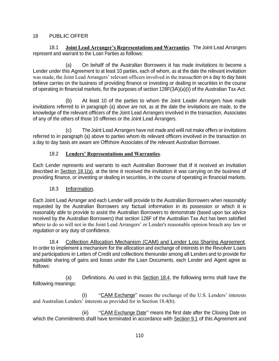 110 18 PUBLIC OFFER 18.1 Joint Lead Arranger’s Representations and Warranties. The Joint Lead Arrangers represent and warrant to the Loan Parties as follows: (a) On behalf of the Australian Borrowers it has made invitations to become a Lender under this Agreement to at least 10 parties, each of whom, as at the date the relevant invitation was made, the Joint Lead Arrangers’ relevant officers involved in the transaction on a day to day basis believe carries on the business of providing finance or investing or dealing in securities in the course of operating in financial markets, for the purposes of section 128F(3A)(a)(i) of the Australian Tax Act. (b) At least 10 of the parties to whom the Joint Leader Arrangers have made invitations referred to in paragraph (a) above are not, as at the date the invitations are made, to the knowledge of the relevant officers of the Joint Lead Arrangers involved in the transaction, Associates of any of the others of those 10 offerees or the Joint Lead Arrangers. (c) The Joint Lead Arrangers have not made and will not make offers or invitations referred to in paragraph (a) above to parties whom its relevant officers involved in the transaction on a day to day basis are aware are Offshore Associates of the relevant Australian Borrower. 18.2 Lenders’ Representations and Warranties. Each Lender represents and warrants to each Australian Borrower that if it received an invitation described in Section 18.1(a), at the time it received the invitation it was carrying on the business of providing finance, or investing or dealing in securities, in the course of operating in financial markets. 18.3 Information. Each Joint Lead Arranger and each Lender will provide to the Australian Borrowers when reasonably requested by the Australian Borrowers any factual information in its possession or which it is reasonably able to provide to assist the Australian Borrowers to demonstrate (based upon tax advice received by the Australian Borrowers) that section 128F of the Australian Tax Act has been satisfied where to do so will not in the Joint Lead Arrangers’ or Lender's reasonable opinion breach any law or regulation or any duty of confidence. 18.4 Collection Allocation Mechanism (CAM) and Lender Loss Sharing Agreement. In order to implement a mechanism for the allocation and exchange of interests in the Revolver Loans and participations in Letters of Credit and collections thereunder among all Lenders and to provide for equitable sharing of gains and losses under the Loan Documents, each Lender and Agent agree as follows: (a) Definitions. As used in this Section 18.4, the following terms shall have the following meanings: (i) “CAM Exchange” means the exchange of the U.S. Lenders’ interests and Australian Lenders’ interests as provided for in Section 18.4(b). (ii) “CAM Exchange Date” means the first date after the Closing Date on which the Commitments shall have terminated in accordance with Section 9.1 of this Agreement and