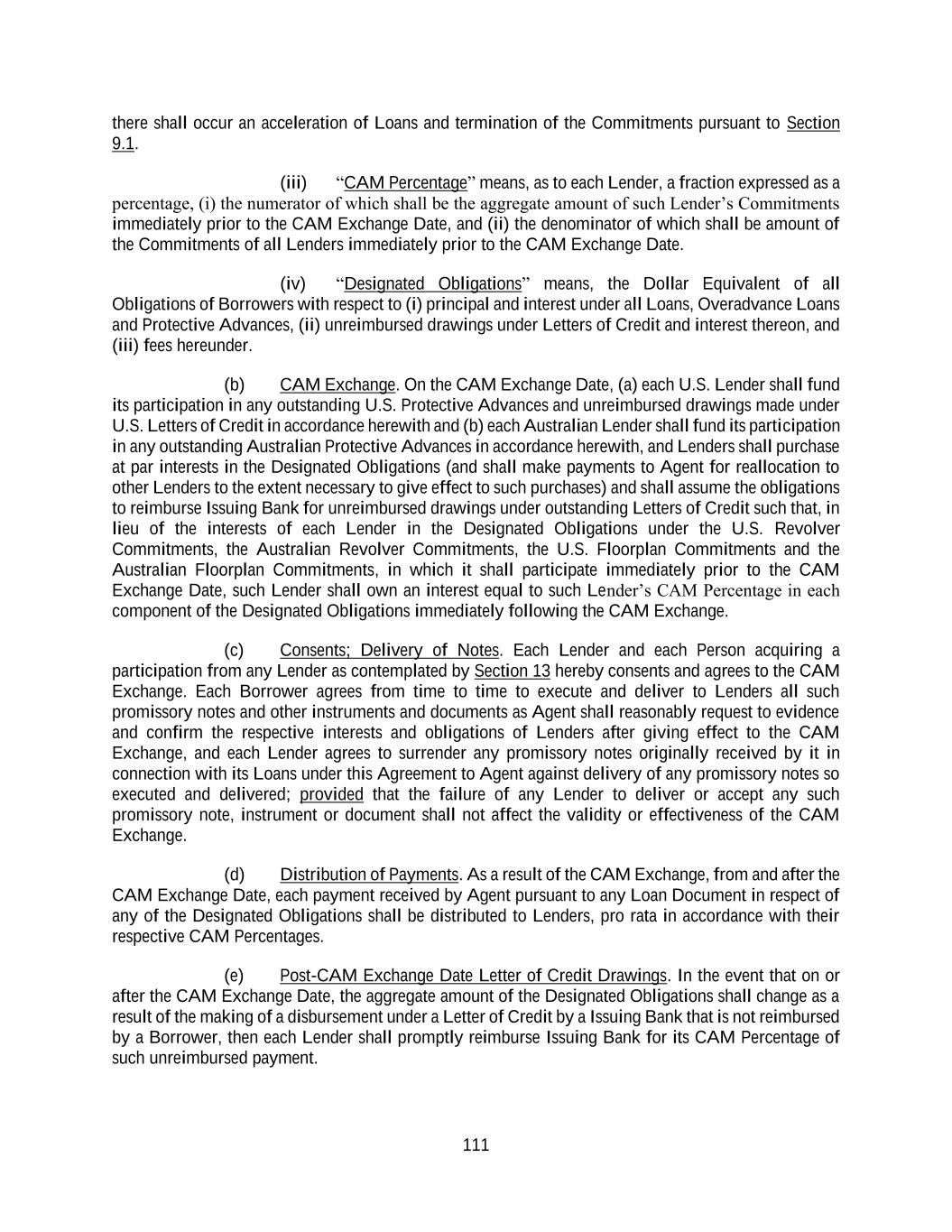 111 there shall occur an acceleration of Loans and termination of the Commitments pursuant to Section 9.1. (iii) “CAM Percentage” means, as to each Lender, a fraction expressed as a percentage, (i) the numerator of which shall be the aggregate amount of such Lender’s Commitments immediately prior to the CAM Exchange Date, and (ii) the denominator of which shall be amount of the Commitments of all Lenders immediately prior to the CAM Exchange Date. (iv) “Designated Obligations” means, the Dollar Equivalent of all Obligations of Borrowers with respect to (i) principal and interest under all Loans, Overadvance Loans and Protective Advances, (ii) unreimbursed drawings under Letters of Credit and interest thereon, and (iii) fees hereunder. (b) CAM Exchange. On the CAM Exchange Date, (a) each U.S. Lender shall fund its participation in any outstanding U.S. Protective Advances and unreimbursed drawings made under U.S. Letters of Credit in accordance herewith and (b) each Australian Lender shall fund its participation in any outstanding Australian Protective Advances in accordance herewith, and Lenders shall purchase at par interests in the Designated Obligations (and shall make payments to Agent for reallocation to other Lenders to the extent necessary to give effect to such purchases) and shall assume the obligations to reimburse Issuing Bank for unreimbursed drawings under outstanding Letters of Credit such that, in lieu of the interests of each Lender in the Designated Obligations under the U.S. Revolver Commitments, the Australian Revolver Commitments, the U.S. Floorplan Commitments and the Australian Floorplan Commitments, in which it shall participate immediately prior to the CAM Exchange Date, such Lender shall own an interest equal to such Lender’s CAM Percentage in each component of the Designated Obligations immediately following the CAM Exchange. (c) Consents; Delivery of Notes. Each Lender and each Person acquiring a participation from any Lender as contemplated by Section 13 hereby consents and agrees to the CAM Exchange. Each Borrower agrees from time to time to execute and deliver to Lenders all such promissory notes and other instruments and documents as Agent shall reasonably request to evidence and confirm the respective interests and obligations of Lenders after giving effect to the CAM Exchange, and each Lender agrees to surrender any promissory notes originally received by it in connection with its Loans under this Agreement to Agent against delivery of any promissory notes so executed and delivered; provided that the failure of any Lender to deliver or accept any such promissory note, instrument or document shall not affect the validity or effectiveness of the CAM Exchange. (d) Distribution of Payments. As a result of the CAM Exchange, from and after the CAM Exchange Date, each payment received by Agent pursuant to any Loan Document in respect of any of the Designated Obligations shall be distributed to Lenders, pro rata in accordance with their respective CAM Percentages. (e) Post-CAM Exchange Date Letter of Credit Drawings. In the event that on or after the CAM Exchange Date, the aggregate amount of the Designated Obligations shall change as a result of the making of a disbursement under a Letter of Credit by a Issuing Bank that is not reimbursed by a Borrower, then each Lender shall promptly reimburse Issuing Bank for its CAM Percentage of such unreimbursed payment.