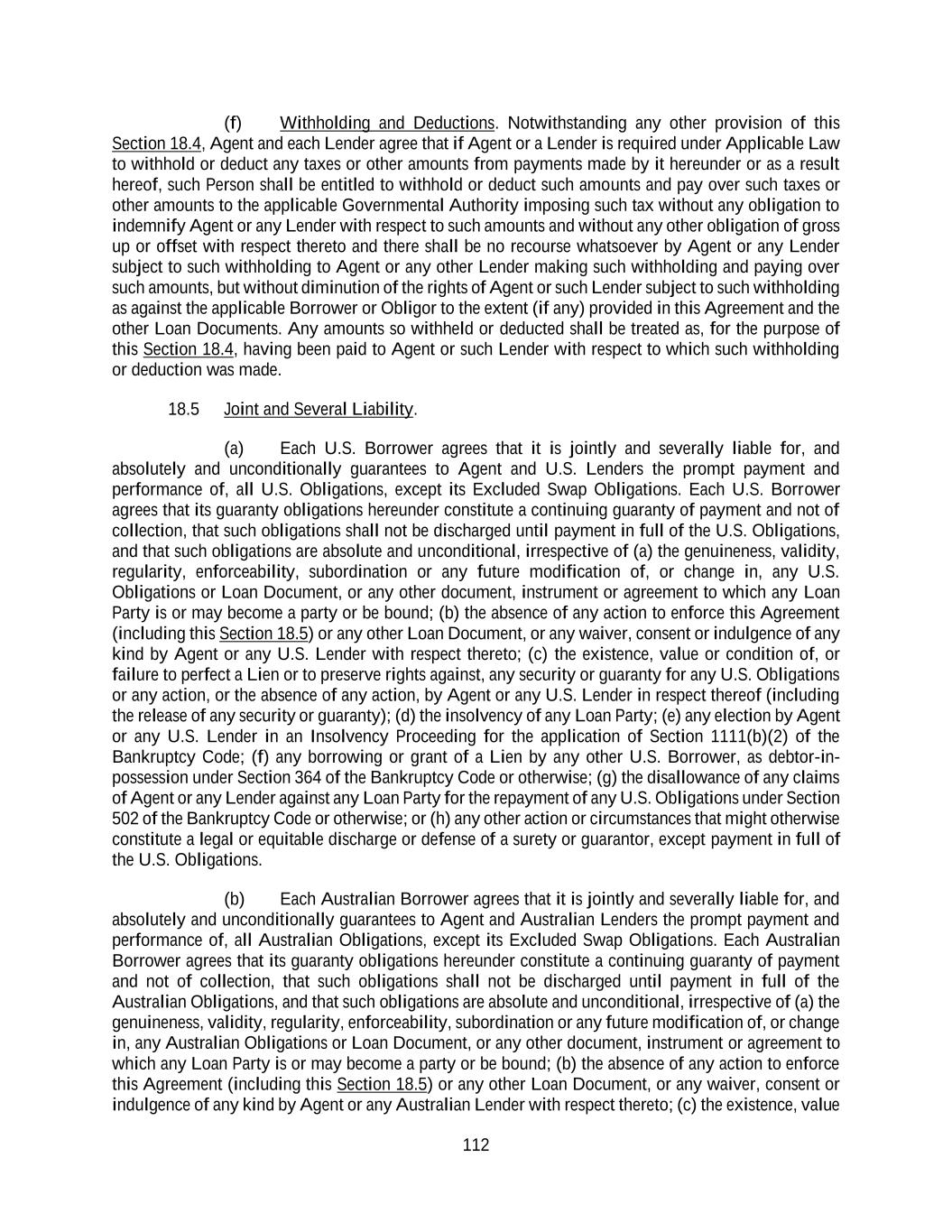 112 (f) Withholding and Deductions. Notwithstanding any other provision of this Section 18.4, Agent and each Lender agree that if Agent or a Lender is required under Applicable Law to withhold or deduct any taxes or other amounts from payments made by it hereunder or as a result hereof, such Person shall be entitled to withhold or deduct such amounts and pay over such taxes or other amounts to the applicable Governmental Authority imposing such tax without any obligation to indemnify Agent or any Lender with respect to such amounts and without any other obligation of gross up or offset with respect thereto and there shall be no recourse whatsoever by Agent or any Lender subject to such withholding to Agent or any other Lender making such withholding and paying over such amounts, but without diminution of the rights of Agent or such Lender subject to such withholding as against the applicable Borrower or Obligor to the extent (if any) provided in this Agreement and the other Loan Documents. Any amounts so withheld or deducted shall be treated as, for the purpose of this Section 18.4, having been paid to Agent or such Lender with respect to which such withholding or deduction was made. 18.5 Joint and Several Liability. (a) Each U.S. Borrower agrees that it is jointly and severally liable for, and absolutely and unconditionally guarantees to Agent and U.S. Lenders the prompt payment and performance of, all U.S. Obligations, except its Excluded Swap Obligations. Each U.S. Borrower agrees that its guaranty obligations hereunder constitute a continuing guaranty of payment and not of collection, that such obligations shall not be discharged until payment in full of the U.S. Obligations, and that such obligations are absolute and unconditional, irrespective of (a) the genuineness, validity, regularity, enforceability, subordination or any future modification of, or change in, any U.S. Obligations or Loan Document, or any other document, instrument or agreement to which any Loan Party is or may become a party or be bound; (b) the absence of any action to enforce this Agreement (including this Section 18.5) or any other Loan Document, or any waiver, consent or indulgence of any kind by Agent or any U.S. Lender with respect thereto; (c) the existence, value or condition of, or failure to perfect a Lien or to preserve rights against, any security or guaranty for any U.S. Obligations or any action, or the absence of any action, by Agent or any U.S. Lender in respect thereof (including the release of any security or guaranty); (d) the insolvency of any Loan Party; (e) any election by Agent or any U.S. Lender in an Insolvency Proceeding for the application of Section 1111(b)(2) of the Bankruptcy Code; (f) any borrowing or grant of a Lien by any other U.S. Borrower, as debtor-in- possession under Section 364 of the Bankruptcy Code or otherwise; (g) the disallowance of any claims of Agent or any Lender against any Loan Party for the repayment of any U.S. Obligations under Section 502 of the Bankruptcy Code or otherwise; or (h) any other action or circumstances that might otherwise constitute a legal or equitable discharge or defense of a surety or guarantor, except payment in full of the U.S. Obligations. (b) Each Australian Borrower agrees that it is jointly and severally liable for, and absolutely and unconditionally guarantees to Agent and Australian Lenders the prompt payment and performance of, all Australian Obligations, except its Excluded Swap Obligations. Each Australian Borrower agrees that its guaranty obligations hereunder constitute a continuing guaranty of payment and not of collection, that such obligations shall not be discharged until payment in full of the Australian Obligations, and that such obligations are absolute and unconditional, irrespective of (a) the genuineness, validity, regularity, enforceability, subordination or any future modification of, or change in, any Australian Obligations or Loan Document, or any other document, instrument or agreement to which any Loan Party is or may become a party or be bound; (b) the absence of any action to enforce this Agreement (including this Section 18.5) or any other Loan Document, or any waiver, consent or indulgence of any kind by Agent or any Australian Lender with respect thereto; (c) the existence, value