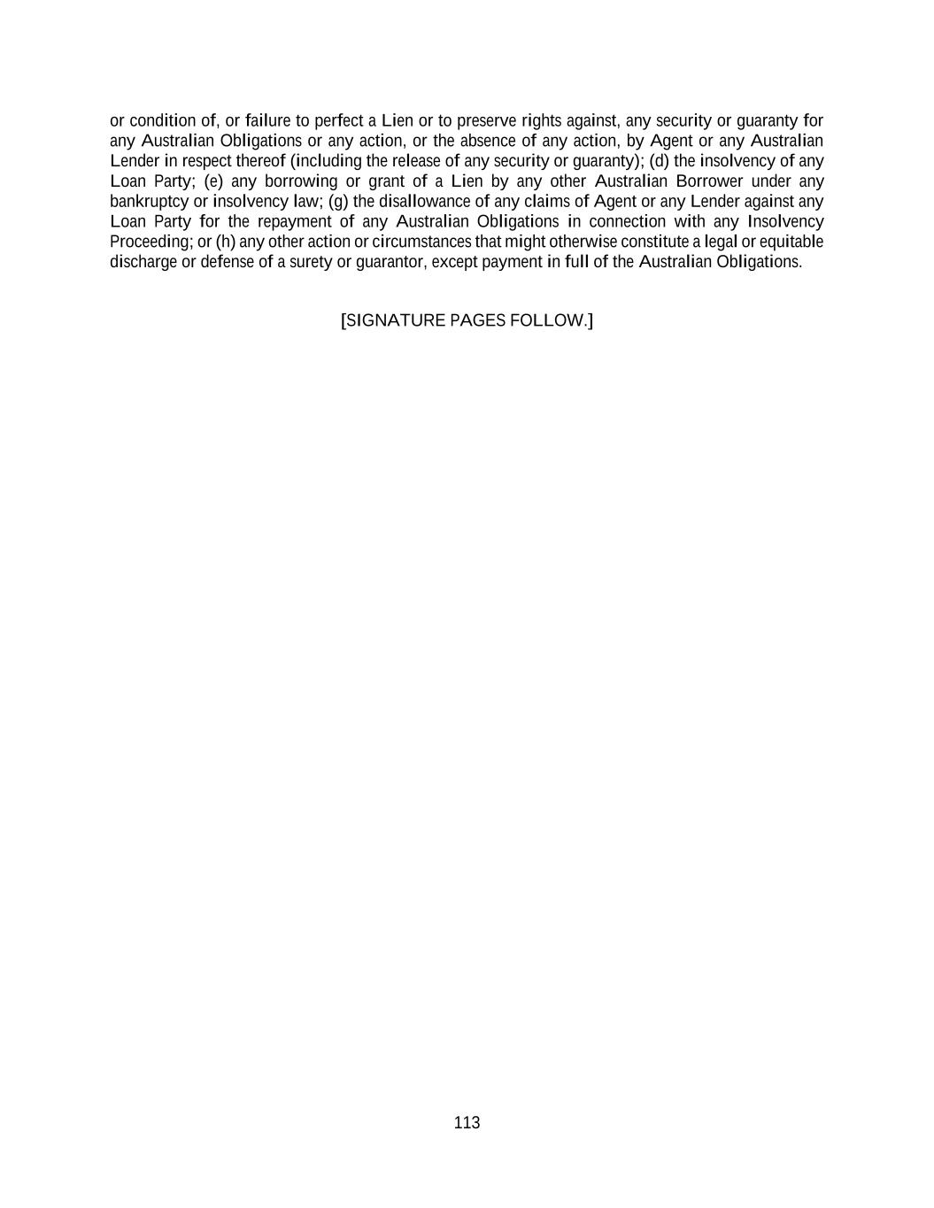 113 or condition of, or failure to perfect a Lien or to preserve rights against, any security or guaranty for any Australian Obligations or any action, or the absence of any action, by Agent or any Australian Lender in respect thereof (including the release of any security or guaranty); (d) the insolvency of any Loan Party; (e) any borrowing or grant of a Lien by any other Australian Borrower under any bankruptcy or insolvency law; (g) the disallowance of any claims of Agent or any Lender against any Loan Party for the repayment of any Australian Obligations in connection with any Insolvency Proceeding; or (h) any other action or circumstances that might otherwise constitute a legal or equitable discharge or defense of a surety or guarantor, except payment in full of the Australian Obligations. [SIGNATURE PAGES FOLLOW.]