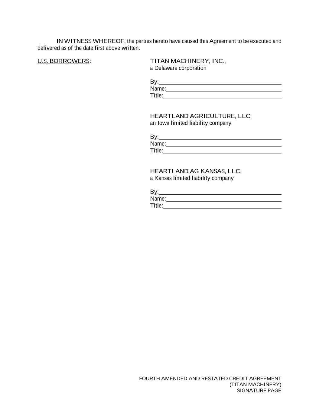 FOURTH AMENDED AND RESTATED CREDIT AGREEMENT (TITAN MACHINERY) SIGNATURE PAGE IN WITNESS WHEREOF, the parties hereto have caused this Agreement to be executed and delivered as of the date first above written. U.S. BORROWERS: TITAN MACHINERY, INC., a Delaware corporation By: Name: Title: HEARTLAND AGRICULTURE, LLC, an Iowa limited liability company By: Name: Title: HEARTLAND AG KANSAS, LLC, a Kansas limited liability company By: Name: Title: