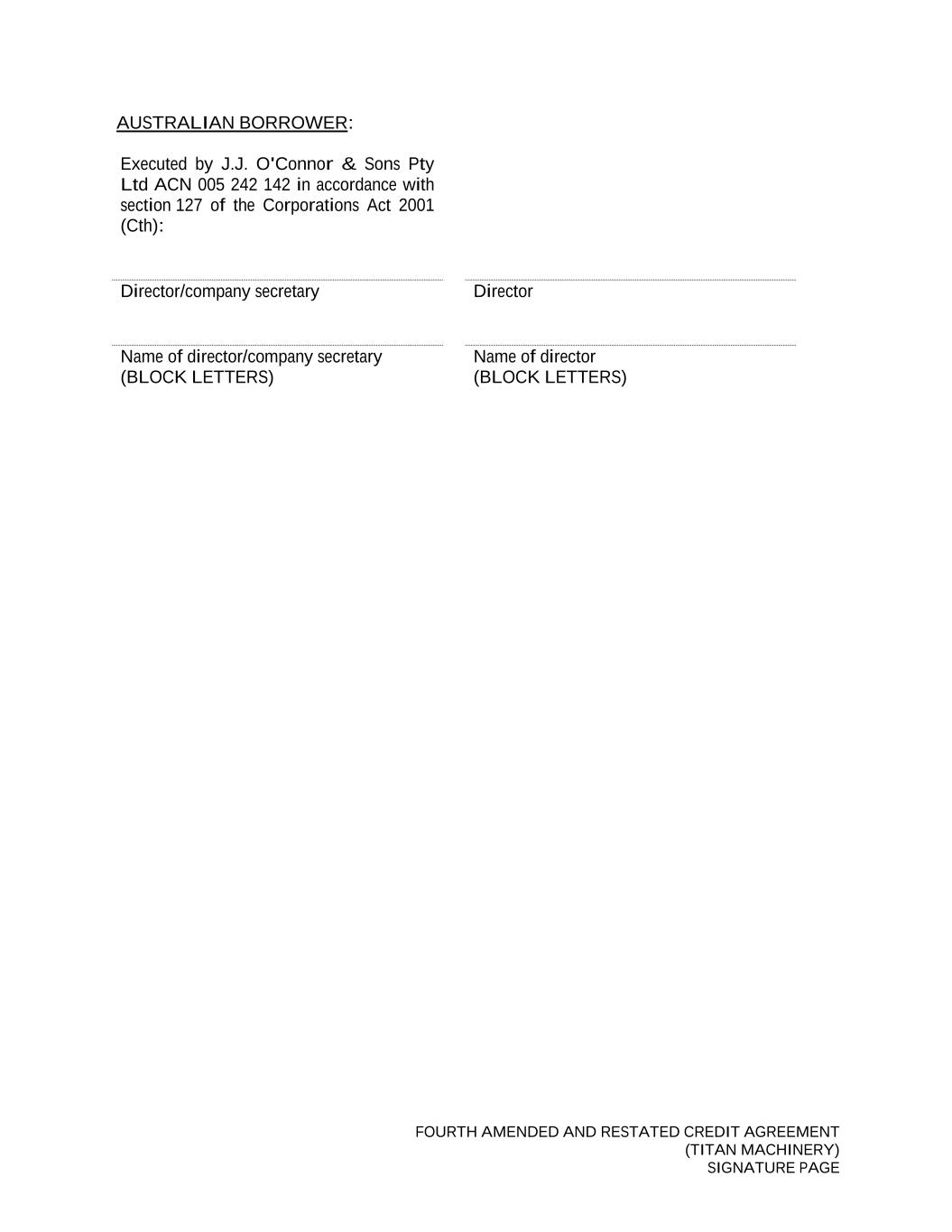 FOURTH AMENDED AND RESTATED CREDIT AGREEMENT (TITAN MACHINERY) SIGNATURE PAGE AUSTRALIAN BORROWER: Executed by J.J. O'Connor & Sons Pty Ltd ACN 005 242 142 in accordance with section 127 of the Corporations Act 2001 (Cth): Director/company secretary Director Name of director/company secretary (BLOCK LETTERS) Name of director (BLOCK LETTERS)