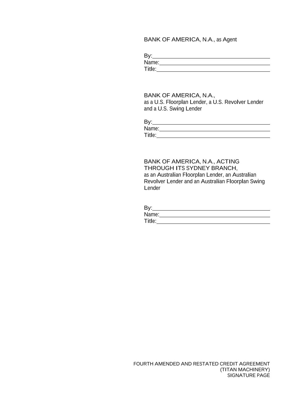 FOURTH AMENDED AND RESTATED CREDIT AGREEMENT (TITAN MACHINERY) SIGNATURE PAGE BANK OF AMERICA, N.A., as Agent By: Name: Title: BANK OF AMERICA, N.A., as a U.S. Floorplan Lender, a U.S. Revolver Lender and a U.S. Swing Lender By: Name: Title: BANK OF AMERICA, N.A., ACTING THROUGH ITS SYDNEY BRANCH, as an Australian Floorplan Lender, an Australian Revolver Lender and an Australian Floorplan Swing Lender By: Name: Title: