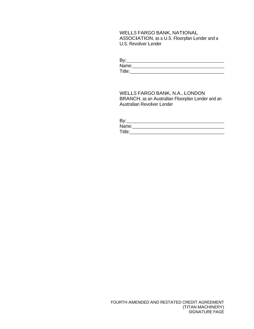 FOURTH AMENDED AND RESTATED CREDIT AGREEMENT (TITAN MACHINERY) SIGNATURE PAGE WELLS FARGO BANK, NATIONAL ASSOCIATION, as a U.S. Floorplan Lender and a U.S. Revolver Lender By: Name: Title: WELLS FARGO BANK, N.A., LONDON BRANCH, as an Australian Floorplan Lender and an Australian Revolver Lender By: Name: Title: