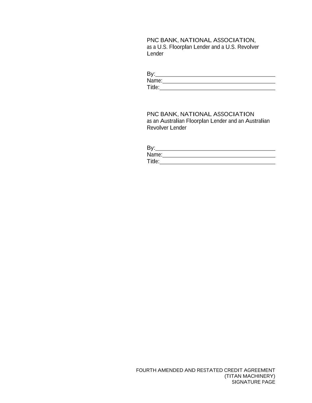 FOURTH AMENDED AND RESTATED CREDIT AGREEMENT (TITAN MACHINERY) SIGNATURE PAGE PNC BANK, NATIONAL ASSOCIATION, as a U.S. Floorplan Lender and a U.S. Revolver Lender By: Name: Title: PNC BANK, NATIONAL ASSOCIATION as an Australian Floorplan Lender and an Australian Revolver Lender By: Name: Title: