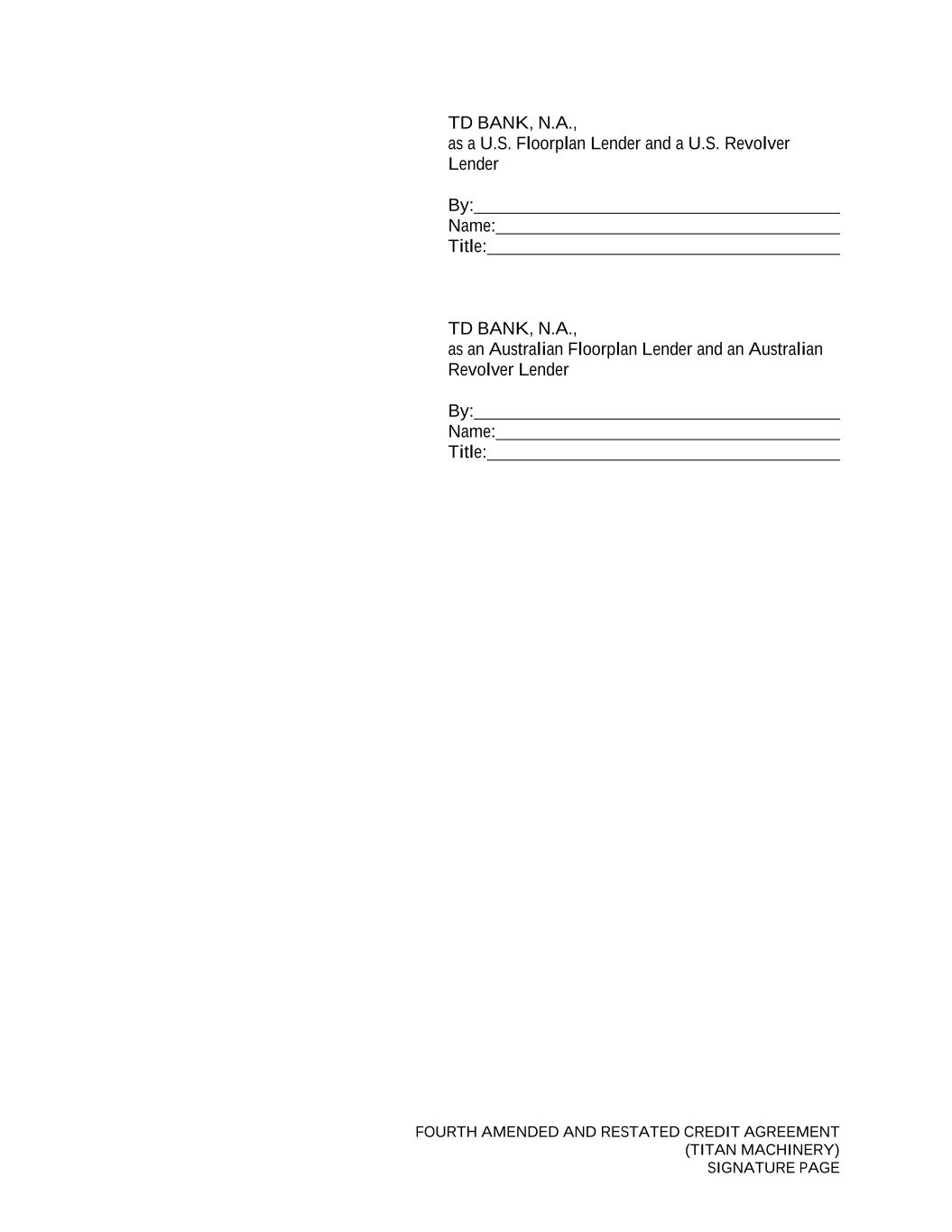 FOURTH AMENDED AND RESTATED CREDIT AGREEMENT (TITAN MACHINERY) SIGNATURE PAGE TD BANK, N.A., as a U.S. Floorplan Lender and a U.S. Revolver Lender By: Name: Title: TD BANK, N.A., as an Australian Floorplan Lender and an Australian Revolver Lender By: Name: Title:
