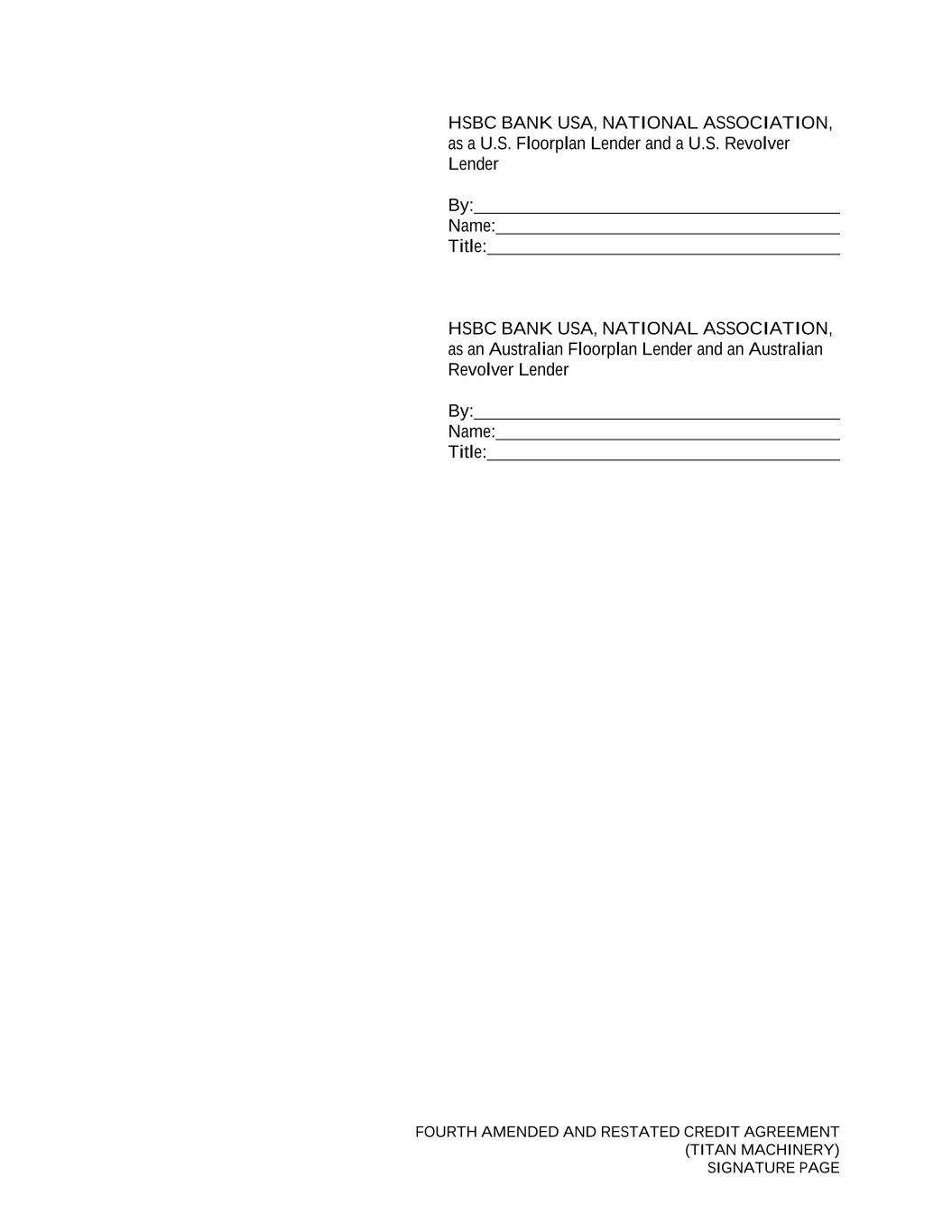 FOURTH AMENDED AND RESTATED CREDIT AGREEMENT (TITAN MACHINERY) SIGNATURE PAGE HSBC BANK USA, NATIONAL ASSOCIATION, as a U.S. Floorplan Lender and a U.S. Revolver Lender By: Name: Title: HSBC BANK USA, NATIONAL ASSOCIATION, as an Australian Floorplan Lender and an Australian Revolver Lender By: Name: Title: