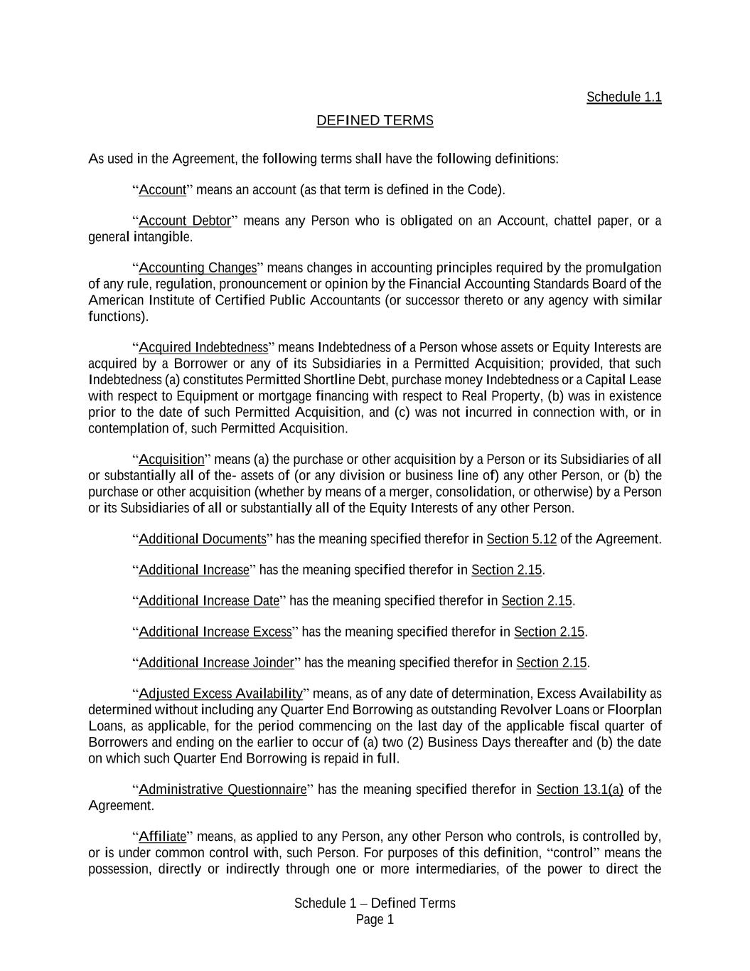 Schedule 1 – Defined Terms Page 1 Schedule 1.1 DEFINED TERMS As used in the Agreement, the following terms shall have the following definitions: “Account” means an account (as that term is defined in the Code). “Account Debtor” means any Person who is obligated on an Account, chattel paper, or a general intangible. “Accounting Changes” means changes in accounting principles required by the promulgation of any rule, regulation, pronouncement or opinion by the Financial Accounting Standards Board of the American Institute of Certified Public Accountants (or successor thereto or any agency with similar functions). “Acquired Indebtedness” means Indebtedness of a Person whose assets or Equity Interests are acquired by a Borrower or any of its Subsidiaries in a Permitted Acquisition; provided, that such Indebtedness (a) constitutes Permitted Shortline Debt, purchase money Indebtedness or a Capital Lease with respect to Equipment or mortgage financing with respect to Real Property, (b) was in existence prior to the date of such Permitted Acquisition, and (c) was not incurred in connection with, or in contemplation of, such Permitted Acquisition. “Acquisition” means (a) the purchase or other acquisition by a Person or its Subsidiaries of all or substantially all of the- assets of (or any division or business line of) any other Person, or (b) the purchase or other acquisition (whether by means of a merger, consolidation, or otherwise) by a Person or its Subsidiaries of all or substantially all of the Equity Interests of any other Person. “Additional Documents” has the meaning specified therefor in Section 5.12 of the Agreement. “Additional Increase” has the meaning specified therefor in Section 2.15. “Additional Increase Date” has the meaning specified therefor in Section 2.15. “Additional Increase Excess” has the meaning specified therefor in Section 2.15. “Additional Increase Joinder” has the meaning specified therefor in Section 2.15. “Adjusted Excess Availability” means, as of any date of determination, Excess Availability as determined without including any Quarter End Borrowing as outstanding Revolver Loans or Floorplan Loans, as applicable, for the period commencing on the last day of the applicable fiscal quarter of Borrowers and ending on the earlier to occur of (a) two (2) Business Days thereafter and (b) the date on which such Quarter End Borrowing is repaid in full. “Administrative Questionnaire” has the meaning specified therefor in Section 13.1(a) of the Agreement. “Affiliate” means, as applied to any Person, any other Person who controls, is controlled by, or is under common control with, such Person. For purposes of this definition, “control” means the possession, directly or indirectly through one or more intermediaries, of the power to direct the