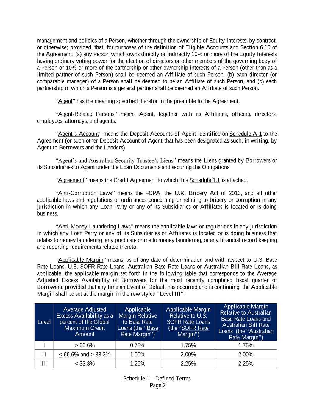 Schedule 1 – Defined Terms Page 2 management and policies of a Person, whether through the ownership of Equity Interests, by contract, or otherwise; provided, that, for purposes of the definition of Eligible Accounts and Section 6.10 of the Agreement: (a) any Person which owns directly or indirectly 10% or more of the Equity Interests having ordinary voting power for the election of directors or other members of the governing body of a Person or 10% or more of the partnership or other ownership interests of a Person (other than as a limited partner of such Person) shall be deemed an Affiliate of such Person, (b) each director (or comparable manager) of a Person shall be deemed to be an Affiliate of such Person, and (c) each partnership in which a Person is a general partner shall be deemed an Affiliate of such Person. “Agent” has the meaning specified therefor in the preamble to the Agreement. “Agent-Related Persons” means Agent, together with its Affiliates, officers, directors, employees, attorneys, and agents. “Agent’s Account” means the Deposit Accounts of Agent identified on Schedule A-1 to the Agreement (or such other Deposit Account of Agent-that has been designated as such, in writing, by Agent to Borrowers and the Lenders). “Agent’s and Australian Security Trustee’s Liens” means the Liens granted by Borrowers or its Subsidiaries to Agent under the Loan Documents and securing the Obligations. “Agreement” means the Credit Agreement to which this Schedule 1.1 is attached. “Anti-Corruption Laws” means the FCPA, the U.K. Bribery Act of 2010, and all other applicable laws and regulations or ordinances concerning or relating to bribery or corruption in any jurisdiction in which any Loan Party or any of its Subsidiaries or Affiliates is located or is doing business. “Anti-Money Laundering Laws” means the applicable laws or regulations in any jurisdiction in which any Loan Party or any of its Subsidiaries or Affiliates is located or is doing business that relates to money laundering, any predicate crime to money laundering, or any financial record keeping and reporting requirements related thereto. “Applicable Margin” means, as of any date of determination and with respect to U.S. Base Rate Loans, U.S. SOFR Rate Loans, Australian Base Rate Loans or Australian Bill Rate Loans, as applicable, the applicable margin set forth in the following table that corresponds to the Average Adjusted Excess Availability of Borrowers for the most recently completed fiscal quarter of Borrowers; provided that any time an Event of Default has occurred and is continuing, the Applicable Margin shall be set at the margin in the row styled “Level III”: Level Average Adjusted Excess Availability as a percent of the Global Maximum Credit Amount Applicable Margin Relative to Base Rate Loans (the “Base Rate Margin”) Applicable Margin Relative to U.S. SOFR Rate Loans (the “SOFR Rate Margin”) Applicable Margin Relative to Australian Base Rate Loans and Australian Bill Rate Loans (the “Australian Rate Margin”) I > 66.6% 0.75% 1.75% 1.75% II < 66.6% and > 33.3% 1.00% 2.00% 2.00% III < 33.3% 1.25% 2.25% 2.25%