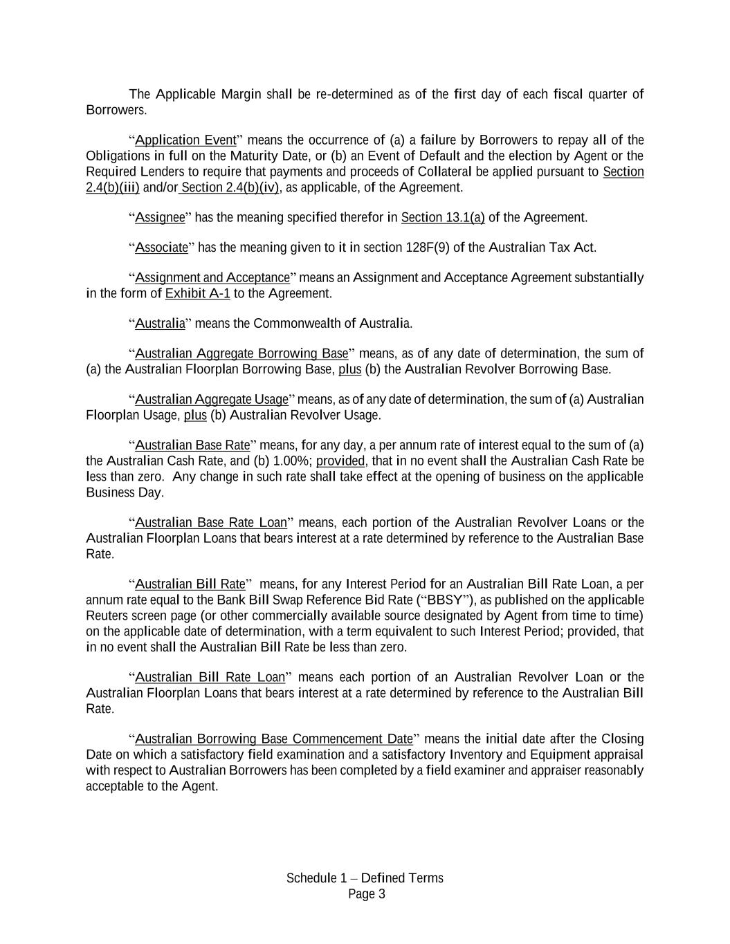 Schedule 1 – Defined Terms Page 3 The Applicable Margin shall be re-determined as of the first day of each fiscal quarter of Borrowers. “Application Event” means the occurrence of (a) a failure by Borrowers to repay all of the Obligations in full on the Maturity Date, or (b) an Event of Default and the election by Agent or the Required Lenders to require that payments and proceeds of Collateral be applied pursuant to Section 2.4(b)(iii) and/or Section 2.4(b)(iv), as applicable, of the Agreement. “Assignee” has the meaning specified therefor in Section 13.1(a) of the Agreement. “Associate” has the meaning given to it in section 128F(9) of the Australian Tax Act. “Assignment and Acceptance” means an Assignment and Acceptance Agreement substantially in the form of Exhibit A-1 to the Agreement. “Australia” means the Commonwealth of Australia. “Australian Aggregate Borrowing Base” means, as of any date of determination, the sum of (a) the Australian Floorplan Borrowing Base, plus (b) the Australian Revolver Borrowing Base. “Australian Aggregate Usage” means, as of any date of determination, the sum of (a) Australian Floorplan Usage, plus (b) Australian Revolver Usage. “Australian Base Rate” means, for any day, a per annum rate of interest equal to the sum of (a) the Australian Cash Rate, and (b) 1.00%; provided, that in no event shall the Australian Cash Rate be less than zero. Any change in such rate shall take effect at the opening of business on the applicable Business Day. “Australian Base Rate Loan” means, each portion of the Australian Revolver Loans or the Australian Floorplan Loans that bears interest at a rate determined by reference to the Australian Base Rate. “Australian Bill Rate” means, for any Interest Period for an Australian Bill Rate Loan, a per annum rate equal to the Bank Bill Swap Reference Bid Rate (“BBSY”), as published on the applicable Reuters screen page (or other commercially available source designated by Agent from time to time) on the applicable date of determination, with a term equivalent to such Interest Period; provided, that in no event shall the Australian Bill Rate be less than zero. “Australian Bill Rate Loan” means each portion of an Australian Revolver Loan or the Australian Floorplan Loans that bears interest at a rate determined by reference to the Australian Bill Rate. “Australian Borrowing Base Commencement Date” means the initial date after the Closing Date on which a satisfactory field examination and a satisfactory Inventory and Equipment appraisal with respect to Australian Borrowers has been completed by a field examiner and appraiser reasonably acceptable to the Agent.