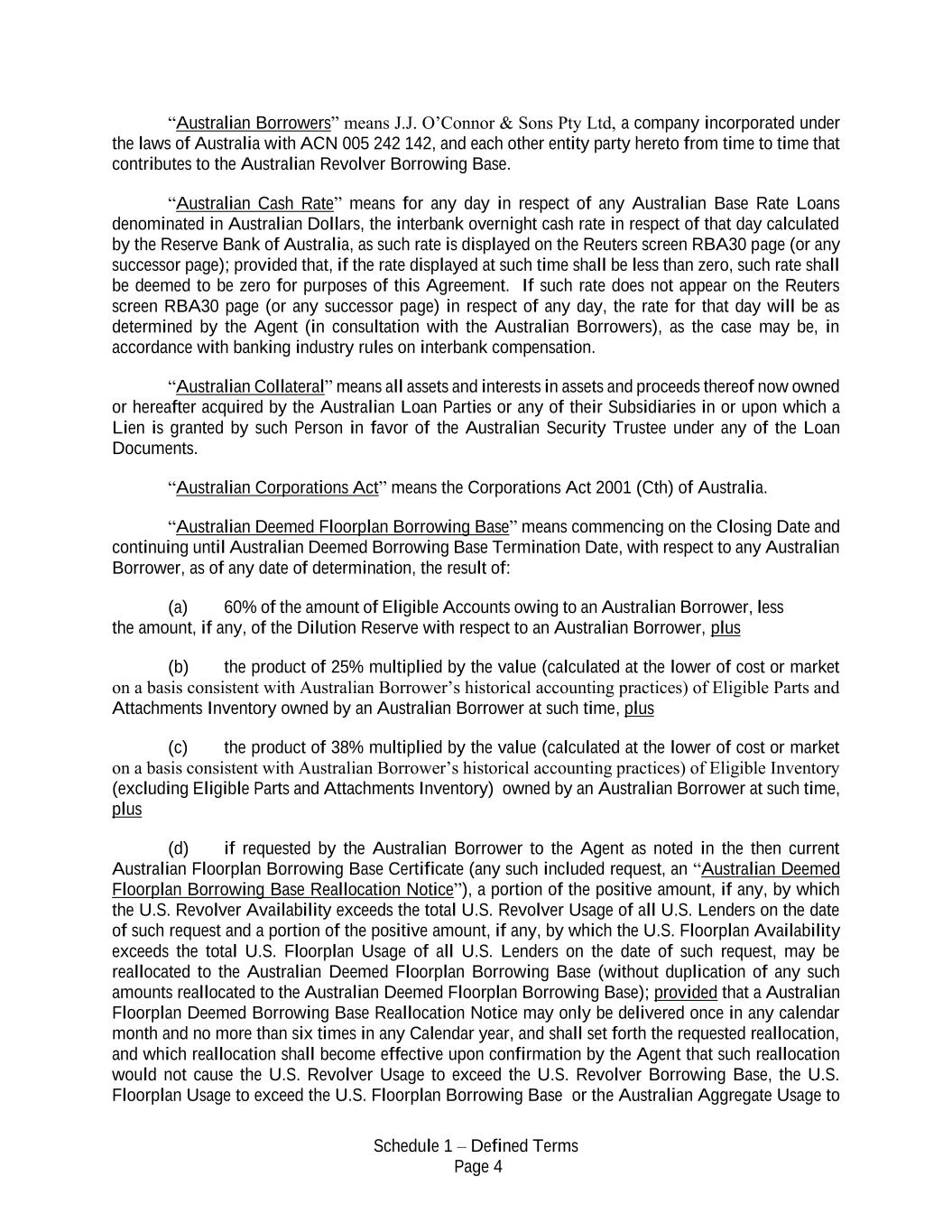 Schedule 1 – Defined Terms Page 4 “Australian Borrowers” means J.J. O’Connor & Sons Pty Ltd, a company incorporated under the laws of Australia with ACN 005 242 142, and each other entity party hereto from time to time that contributes to the Australian Revolver Borrowing Base. “Australian Cash Rate” means for any day in respect of any Australian Base Rate Loans denominated in Australian Dollars, the interbank overnight cash rate in respect of that day calculated by the Reserve Bank of Australia, as such rate is displayed on the Reuters screen RBA30 page (or any successor page); provided that, if the rate displayed at such time shall be less than zero, such rate shall be deemed to be zero for purposes of this Agreement. If such rate does not appear on the Reuters screen RBA30 page (or any successor page) in respect of any day, the rate for that day will be as determined by the Agent (in consultation with the Australian Borrowers), as the case may be, in accordance with banking industry rules on interbank compensation. “Australian Collateral” means all assets and interests in assets and proceeds thereof now owned or hereafter acquired by the Australian Loan Parties or any of their Subsidiaries in or upon which a Lien is granted by such Person in favor of the Australian Security Trustee under any of the Loan Documents. “Australian Corporations Act” means the Corporations Act 2001 (Cth) of Australia. “Australian Deemed Floorplan Borrowing Base” means commencing on the Closing Date and continuing until Australian Deemed Borrowing Base Termination Date, with respect to any Australian Borrower, as of any date of determination, the result of: (a) 60% of the amount of Eligible Accounts owing to an Australian Borrower, less the amount, if any, of the Dilution Reserve with respect to an Australian Borrower, plus (b) the product of 25% multiplied by the value (calculated at the lower of cost or market on a basis consistent with Australian Borrower’s historical accounting practices) of Eligible Parts and Attachments Inventory owned by an Australian Borrower at such time, plus (c) the product of 38% multiplied by the value (calculated at the lower of cost or market on a basis consistent with Australian Borrower’s historical accounting practices) of Eligible Inventory (excluding Eligible Parts and Attachments Inventory) owned by an Australian Borrower at such time, plus (d) if requested by the Australian Borrower to the Agent as noted in the then current Australian Floorplan Borrowing Base Certificate (any such included request, an “Australian Deemed Floorplan Borrowing Base Reallocation Notice”), a portion of the positive amount, if any, by which the U.S. Revolver Availability exceeds the total U.S. Revolver Usage of all U.S. Lenders on the date of such request and a portion of the positive amount, if any, by which the U.S. Floorplan Availability exceeds the total U.S. Floorplan Usage of all U.S. Lenders on the date of such request, may be reallocated to the Australian Deemed Floorplan Borrowing Base (without duplication of any such amounts reallocated to the Australian Deemed Floorplan Borrowing Base); provided that a Australian Floorplan Deemed Borrowing Base Reallocation Notice may only be delivered once in any calendar month and no more than six times in any Calendar year, and shall set forth the requested reallocation, and which reallocation shall become effective upon confirmation by the Agent that such reallocation would not cause the U.S. Revolver Usage to exceed the U.S. Revolver Borrowing Base, the U.S. Floorplan Usage to exceed the U.S. Floorplan Borrowing Base or the Australian Aggregate Usage to