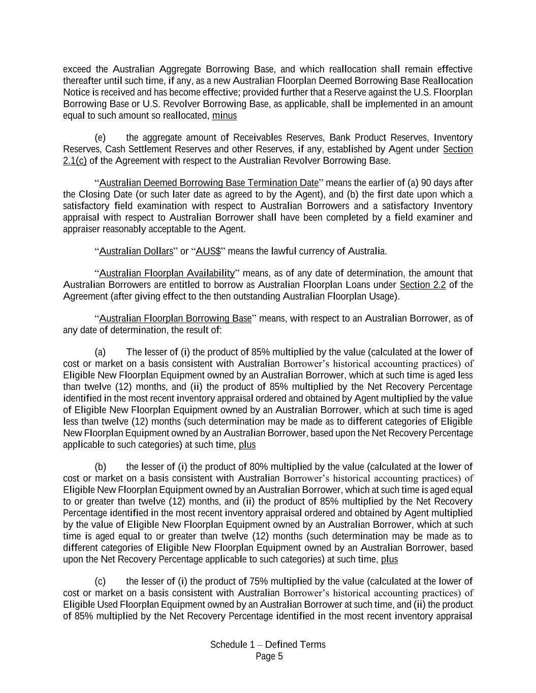 Schedule 1 – Defined Terms Page 5 exceed the Australian Aggregate Borrowing Base, and which reallocation shall remain effective thereafter until such time, if any, as a new Australian Floorplan Deemed Borrowing Base Reallocation Notice is received and has become effective; provided further that a Reserve against the U.S. Floorplan Borrowing Base or U.S. Revolver Borrowing Base, as applicable, shall be implemented in an amount equal to such amount so reallocated, minus (e) the aggregate amount of Receivables Reserves, Bank Product Reserves, Inventory Reserves, Cash Settlement Reserves and other Reserves, if any, established by Agent under Section 2.1(c) of the Agreement with respect to the Australian Revolver Borrowing Base. “Australian Deemed Borrowing Base Termination Date” means the earlier of (a) 90 days after the Closing Date (or such later date as agreed to by the Agent), and (b) the first date upon which a satisfactory field examination with respect to Australian Borrowers and a satisfactory Inventory appraisal with respect to Australian Borrower shall have been completed by a field examiner and appraiser reasonably acceptable to the Agent. “Australian Dollars” or “AUS$” means the lawful currency of Australia. “Australian Floorplan Availability” means, as of any date of determination, the amount that Australian Borrowers are entitled to borrow as Australian Floorplan Loans under Section 2.2 of the Agreement (after giving effect to the then outstanding Australian Floorplan Usage). “Australian Floorplan Borrowing Base” means, with respect to an Australian Borrower, as of any date of determination, the result of: (a) The lesser of (i) the product of 85% multiplied by the value (calculated at the lower of cost or market on a basis consistent with Australian Borrower’s historical accounting practices) of Eligible New Floorplan Equipment owned by an Australian Borrower, which at such time is aged less than twelve (12) months, and (ii) the product of 85% multiplied by the Net Recovery Percentage identified in the most recent inventory appraisal ordered and obtained by Agent multiplied by the value of Eligible New Floorplan Equipment owned by an Australian Borrower, which at such time is aged less than twelve (12) months (such determination may be made as to different categories of Eligible New Floorplan Equipment owned by an Australian Borrower, based upon the Net Recovery Percentage applicable to such categories) at such time, plus (b) the lesser of (i) the product of 80% multiplied by the value (calculated at the lower of cost or market on a basis consistent with Australian Borrower’s historical accounting practices) of Eligible New Floorplan Equipment owned by an Australian Borrower, which at such time is aged equal to or greater than twelve (12) months, and (ii) the product of 85% multiplied by the Net Recovery Percentage identified in the most recent inventory appraisal ordered and obtained by Agent multiplied by the value of Eligible New Floorplan Equipment owned by an Australian Borrower, which at such time is aged equal to or greater than twelve (12) months (such determination may be made as to different categories of Eligible New Floorplan Equipment owned by an Australian Borrower, based upon the Net Recovery Percentage applicable to such categories) at such time, plus (c) the lesser of (i) the product of 75% multiplied by the value (calculated at the lower of cost or market on a basis consistent with Australian Borrower’s historical accounting practices) of Eligible Used Floorplan Equipment owned by an Australian Borrower at such time, and (ii) the product of 85% multiplied by the Net Recovery Percentage identified in the most recent inventory appraisal