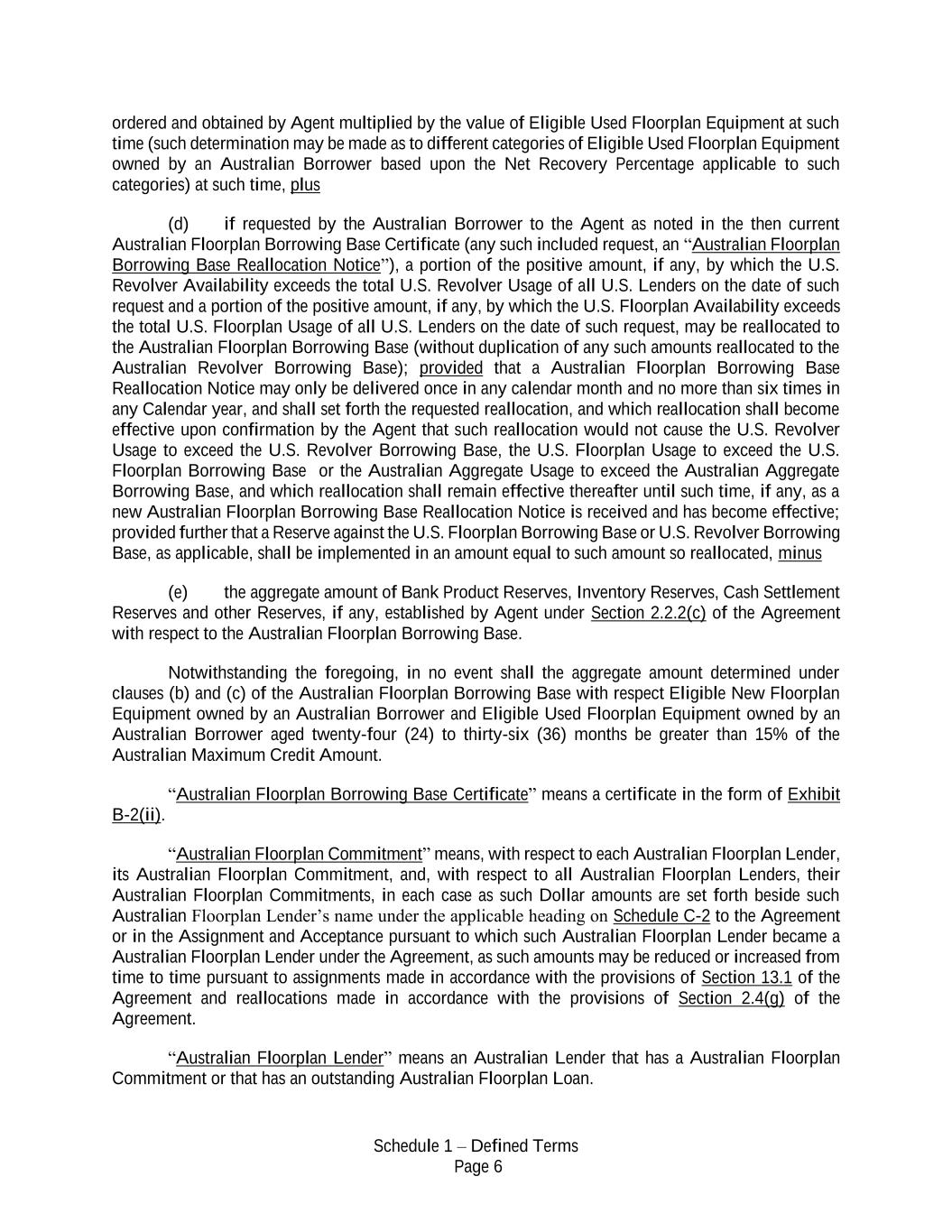 Schedule 1 – Defined Terms Page 6 ordered and obtained by Agent multiplied by the value of Eligible Used Floorplan Equipment at such time (such determination may be made as to different categories of Eligible Used Floorplan Equipment owned by an Australian Borrower based upon the Net Recovery Percentage applicable to such categories) at such time, plus (d) if requested by the Australian Borrower to the Agent as noted in the then current Australian Floorplan Borrowing Base Certificate (any such included request, an “Australian Floorplan Borrowing Base Reallocation Notice”), a portion of the positive amount, if any, by which the U.S. Revolver Availability exceeds the total U.S. Revolver Usage of all U.S. Lenders on the date of such request and a portion of the positive amount, if any, by which the U.S. Floorplan Availability exceeds the total U.S. Floorplan Usage of all U.S. Lenders on the date of such request, may be reallocated to the Australian Floorplan Borrowing Base (without duplication of any such amounts reallocated to the Australian Revolver Borrowing Base); provided that a Australian Floorplan Borrowing Base Reallocation Notice may only be delivered once in any calendar month and no more than six times in any Calendar year, and shall set forth the requested reallocation, and which reallocation shall become effective upon confirmation by the Agent that such reallocation would not cause the U.S. Revolver Usage to exceed the U.S. Revolver Borrowing Base, the U.S. Floorplan Usage to exceed the U.S. Floorplan Borrowing Base or the Australian Aggregate Usage to exceed the Australian Aggregate Borrowing Base, and which reallocation shall remain effective thereafter until such time, if any, as a new Australian Floorplan Borrowing Base Reallocation Notice is received and has become effective; provided further that a Reserve against the U.S. Floorplan Borrowing Base or U.S. Revolver Borrowing Base, as applicable, shall be implemented in an amount equal to such amount so reallocated, minus (e) the aggregate amount of Bank Product Reserves, Inventory Reserves, Cash Settlement Reserves and other Reserves, if any, established by Agent under Section 2.2.2(c) of the Agreement with respect to the Australian Floorplan Borrowing Base. Notwithstanding the foregoing, in no event shall the aggregate amount determined under clauses (b) and (c) of the Australian Floorplan Borrowing Base with respect Eligible New Floorplan Equipment owned by an Australian Borrower and Eligible Used Floorplan Equipment owned by an Australian Borrower aged twenty-four (24) to thirty-six (36) months be greater than 15% of the Australian Maximum Credit Amount. “Australian Floorplan Borrowing Base Certificate” means a certificate in the form of Exhibit B-2(ii). “Australian Floorplan Commitment” means, with respect to each Australian Floorplan Lender, its Australian Floorplan Commitment, and, with respect to all Australian Floorplan Lenders, their Australian Floorplan Commitments, in each case as such Dollar amounts are set forth beside such Australian Floorplan Lender’s name under the applicable heading on Schedule C-2 to the Agreement or in the Assignment and Acceptance pursuant to which such Australian Floorplan Lender became a Australian Floorplan Lender under the Agreement, as such amounts may be reduced or increased from time to time pursuant to assignments made in accordance with the provisions of Section 13.1 of the Agreement and reallocations made in accordance with the provisions of Section 2.4(g) of the Agreement. “Australian Floorplan Lender” means an Australian Lender that has a Australian Floorplan Commitment or that has an outstanding Australian Floorplan Loan.