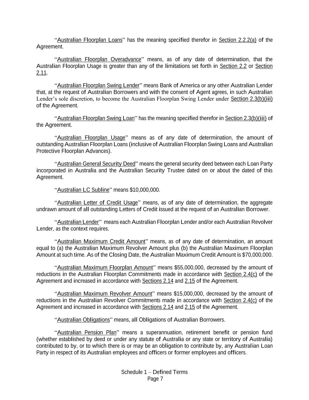 Schedule 1 – Defined Terms Page 7 “Australian Floorplan Loans” has the meaning specified therefor in Section 2.2.2(a) of the Agreement. “Australian Floorplan Overadvance” means, as of any date of determination, that the Australian Floorplan Usage is greater than any of the limitations set forth in Section 2.2 or Section 2.11. “Australian Floorplan Swing Lender” means Bank of America or any other Australian Lender that, at the request of Australian Borrowers and with the consent of Agent agrees, in such Australian Lender’s sole discretion, to become the Australian Floorplan Swing Lender under Section 2.3(b)(iii) of the Agreement. “Australian Floorplan Swing Loan” has the meaning specified therefor in Section 2.3(b)(iii) of the Agreement. “Australian Floorplan Usage” means as of any date of determination, the amount of outstanding Australian Floorplan Loans (inclusive of Australian Floorplan Swing Loans and Australian Protective Floorplan Advances). “Australian General Security Deed” means the general security deed between each Loan Party incorporated in Australia and the Australian Security Trustee dated on or about the dated of this Agreement. “Australian LC Subline” means $10,000,000. “Australian Letter of Credit Usage” means, as of any date of determination, the aggregate undrawn amount of all outstanding Letters of Credit issued at the request of an Australian Borrower. “Australian Lender” means each Australian Floorplan Lender and/or each Australian Revolver Lender, as the context requires. “Australian Maximum Credit Amount” means, as of any date of determination, an amount equal to (a) the Australian Maximum Revolver Amount plus (b) the Australian Maximum Floorplan Amount at such time. As of the Closing Date, the Australian Maximum Credit Amount is $70,000,000. “Australian Maximum Floorplan Amount” means $55,000,000, decreased by the amount of reductions in the Australian Floorplan Commitments made in accordance with Section 2.4(c) of the Agreement and increased in accordance with Sections 2.14 and 2.15 of the Agreement. “Australian Maximum Revolver Amount” means $15,000,000, decreased by the amount of reductions in the Australian Revolver Commitments made in accordance with Section 2.4(c) of the Agreement and increased in accordance with Sections 2.14 and 2.15 of the Agreement. “Australian Obligations” means, all Obligations of Australian Borrowers. “Australian Pension Plan” means a superannuation, retirement benefit or pension fund (whether established by deed or under any statute of Australia or any state or territory of Australia) contributed to by, or to which there is or may be an obligation to contribute by, any Australian Loan Party in respect of its Australian employees and officers or former employees and officers.