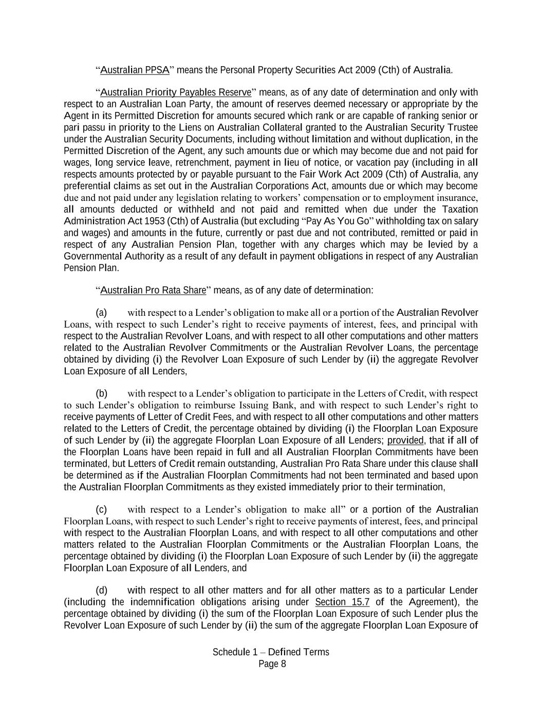 Schedule 1 – Defined Terms Page 8 “Australian PPSA” means the Personal Property Securities Act 2009 (Cth) of Australia. “Australian Priority Payables Reserve” means, as of any date of determination and only with respect to an Australian Loan Party, the amount of reserves deemed necessary or appropriate by the Agent in its Permitted Discretion for amounts secured which rank or are capable of ranking senior or pari passu in priority to the Liens on Australian Collateral granted to the Australian Security Trustee under the Australian Security Documents, including without limitation and without duplication, in the Permitted Discretion of the Agent, any such amounts due or which may become due and not paid for wages, long service leave, retrenchment, payment in lieu of notice, or vacation pay (including in all respects amounts protected by or payable pursuant to the Fair Work Act 2009 (Cth) of Australia, any preferential claims as set out in the Australian Corporations Act, amounts due or which may become due and not paid under any legislation relating to workers’ compensation or to employment insurance, all amounts deducted or withheld and not paid and remitted when due under the Taxation Administration Act 1953 (Cth) of Australia (but excluding “Pay As You Go” withholding tax on salary and wages) and amounts in the future, currently or past due and not contributed, remitted or paid in respect of any Australian Pension Plan, together with any charges which may be levied by a Governmental Authority as a result of any default in payment obligations in respect of any Australian Pension Plan. “Australian Pro Rata Share” means, as of any date of determination: (a) with respect to a Lender’s obligation to make all or a portion of the Australian Revolver Loans, with respect to such Lender’s right to receive payments of interest, fees, and principal with respect to the Australian Revolver Loans, and with respect to all other computations and other matters related to the Australian Revolver Commitments or the Australian Revolver Loans, the percentage obtained by dividing (i) the Revolver Loan Exposure of such Lender by (ii) the aggregate Revolver Loan Exposure of all Lenders, (b) with respect to a Lender’s obligation to participate in the Letters of Credit, with respect to such Lender’s obligation to reimburse Issuing Bank, and with respect to such Lender’s right to receive payments of Letter of Credit Fees, and with respect to all other computations and other matters related to the Letters of Credit, the percentage obtained by dividing (i) the Floorplan Loan Exposure of such Lender by (ii) the aggregate Floorplan Loan Exposure of all Lenders; provided, that if all of the Floorplan Loans have been repaid in full and all Australian Floorplan Commitments have been terminated, but Letters of Credit remain outstanding, Australian Pro Rata Share under this clause shall be determined as if the Australian Floorplan Commitments had not been terminated and based upon the Australian Floorplan Commitments as they existed immediately prior to their termination, (c) with respect to a Lender’s obligation to make all” or a portion of the Australian Floorplan Loans, with respect to such Lender’s right to receive payments of interest, fees, and principal with respect to the Australian Floorplan Loans, and with respect to all other computations and other matters related to the Australian Floorplan Commitments or the Australian Floorplan Loans, the percentage obtained by dividing (i) the Floorplan Loan Exposure of such Lender by (ii) the aggregate Floorplan Loan Exposure of all Lenders, and (d) with respect to all other matters and for all other matters as to a particular Lender (including the indemnification obligations arising under Section 15.7 of the Agreement), the percentage obtained by dividing (i) the sum of the Floorplan Loan Exposure of such Lender plus the Revolver Loan Exposure of such Lender by (ii) the sum of the aggregate Floorplan Loan Exposure of