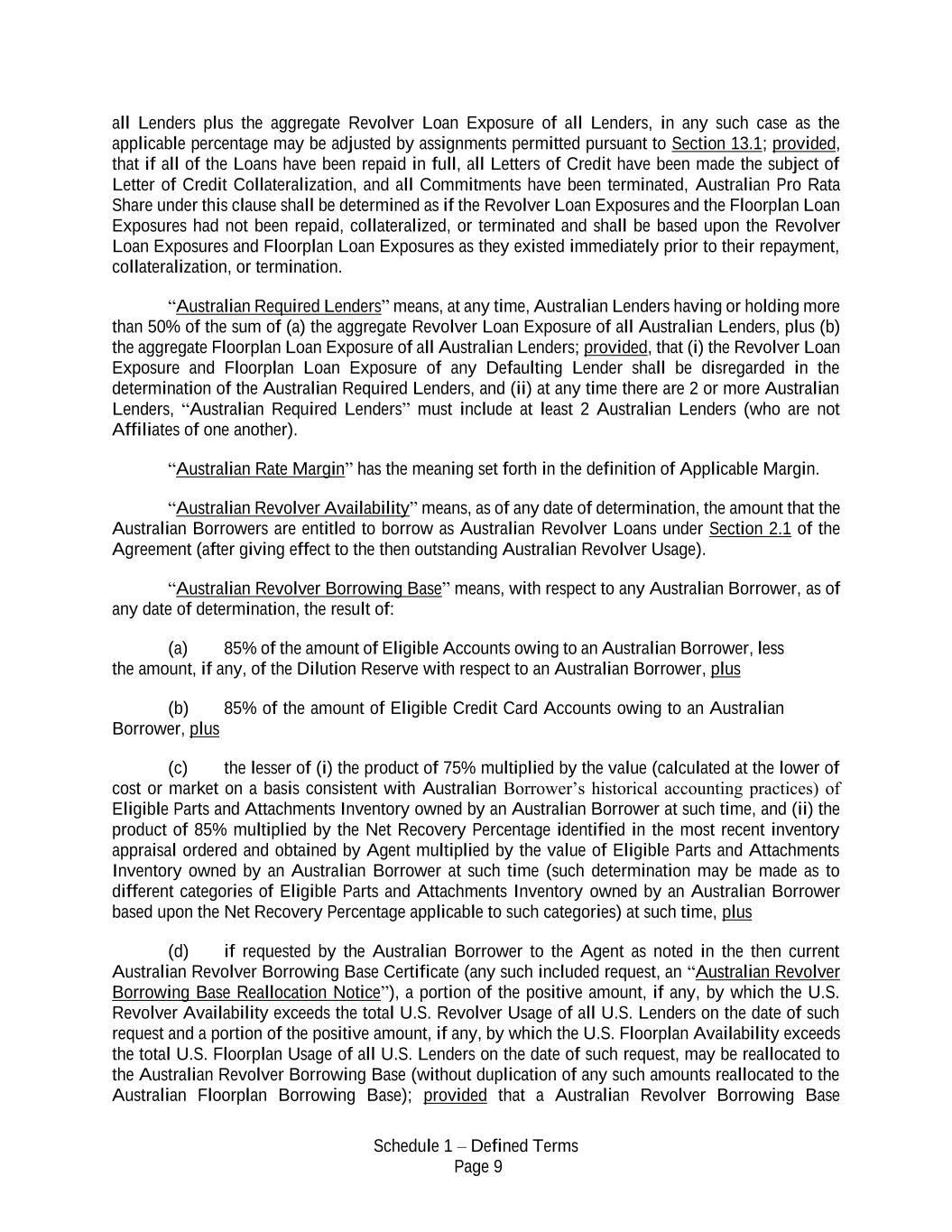 Schedule 1 – Defined Terms Page 9 all Lenders plus the aggregate Revolver Loan Exposure of all Lenders, in any such case as the applicable percentage may be adjusted by assignments permitted pursuant to Section 13.1; provided, that if all of the Loans have been repaid in full, all Letters of Credit have been made the subject of Letter of Credit Collateralization, and all Commitments have been terminated, Australian Pro Rata Share under this clause shall be determined as if the Revolver Loan Exposures and the Floorplan Loan Exposures had not been repaid, collateralized, or terminated and shall be based upon the Revolver Loan Exposures and Floorplan Loan Exposures as they existed immediately prior to their repayment, collateralization, or termination. “Australian Required Lenders” means, at any time, Australian Lenders having or holding more than 50% of the sum of (a) the aggregate Revolver Loan Exposure of all Australian Lenders, plus (b) the aggregate Floorplan Loan Exposure of all Australian Lenders; provided, that (i) the Revolver Loan Exposure and Floorplan Loan Exposure of any Defaulting Lender shall be disregarded in the determination of the Australian Required Lenders, and (ii) at any time there are 2 or more Australian Lenders, “Australian Required Lenders” must include at least 2 Australian Lenders (who are not Affiliates of one another). “Australian Rate Margin” has the meaning set forth in the definition of Applicable Margin. “Australian Revolver Availability” means, as of any date of determination, the amount that the Australian Borrowers are entitled to borrow as Australian Revolver Loans under Section 2.1 of the Agreement (after giving effect to the then outstanding Australian Revolver Usage). “Australian Revolver Borrowing Base” means, with respect to any Australian Borrower, as of any date of determination, the result of: (a) 85% of the amount of Eligible Accounts owing to an Australian Borrower, less the amount, if any, of the Dilution Reserve with respect to an Australian Borrower, plus (b) 85% of the amount of Eligible Credit Card Accounts owing to an Australian Borrower, plus (c) the lesser of (i) the product of 75% multiplied by the value (calculated at the lower of cost or market on a basis consistent with Australian Borrower’s historical accounting practices) of Eligible Parts and Attachments Inventory owned by an Australian Borrower at such time, and (ii) the product of 85% multiplied by the Net Recovery Percentage identified in the most recent inventory appraisal ordered and obtained by Agent multiplied by the value of Eligible Parts and Attachments Inventory owned by an Australian Borrower at such time (such determination may be made as to different categories of Eligible Parts and Attachments Inventory owned by an Australian Borrower based upon the Net Recovery Percentage applicable to such categories) at such time, plus (d) if requested by the Australian Borrower to the Agent as noted in the then current Australian Revolver Borrowing Base Certificate (any such included request, an “Australian Revolver Borrowing Base Reallocation Notice”), a portion of the positive amount, if any, by which the U.S. Revolver Availability exceeds the total U.S. Revolver Usage of all U.S. Lenders on the date of such request and a portion of the positive amount, if any, by which the U.S. Floorplan Availability exceeds the total U.S. Floorplan Usage of all U.S. Lenders on the date of such request, may be reallocated to the Australian Revolver Borrowing Base (without duplication of any such amounts reallocated to the Australian Floorplan Borrowing Base); provided that a Australian Revolver Borrowing Base