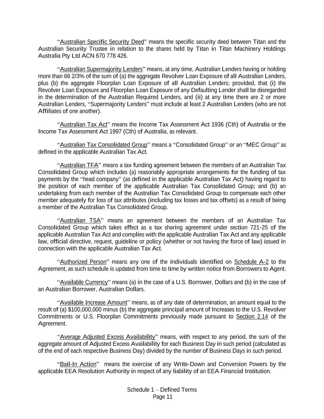 Schedule 1 – Defined Terms Page 11 “Australian Specific Security Deed” means the specific security deed between Titan and the Australian Security Trustee in relation to the shares held by Titan in Titan Machinery Holdings Australia Pty Ltd ACN 670 778 426. “Australian Supermajority Lenders” means, at any time, Australian Lenders having or holding more than 66 2/3% of the sum of (a) the aggregate Revolver Loan Exposure of all Australian Lenders, plus (b) the aggregate Floorplan Loan Exposure of all Australian Lenders; provided, that (i) the Revolver Loan Exposure and Floorplan Loan Exposure of any Defaulting Lender shall be disregarded in the determination of the Australian Required Lenders, and (ii) at any time there are 2 or more Australian Lenders, “Supermajority Lenders” must include at least 2 Australian Lenders (who are not Affiliates of one another). “Australian Tax Act” means the Income Tax Assessment Act 1936 (Cth) of Australia or the Income Tax Assessment Act 1997 (Cth) of Australia, as relevant. “Australian Tax Consolidated Group” means a “Consolidated Group” or an “MEC Group” as defined in the applicable Australian Tax Act. “Australian TFA” means a tax funding agreement between the members of an Australian Tax Consolidated Group which includes (a) reasonably appropriate arrangements for the funding of tax payments by the “head company” (as defined in the applicable Australian Tax Act) having regard to the position of each member of the applicable Australian Tax Consolidated Group; and (b) an undertaking from each member of the Australian Tax Consolidated Group to compensate each other member adequately for loss of tax attributes (including tax losses and tax offsets) as a result of being a member of the Australian Tax Consolidated Group. “Australian TSA” means an agreement between the members of an Australian Tax Consolidated Group which takes effect as a tax sharing agreement under section 721-25 of the applicable Australian Tax Act and complies with the applicable Australian Tax Act and any applicable law, official directive, request, guideline or policy (whether or not having the force of law) issued in connection with the applicable Australian Tax Act. “Authorized Person” means any one of the individuals identified on Schedule A-2 to the Agreement, as such schedule is updated from time to time by written notice from Borrowers to Agent. “Available Currency” means (a) in the case of a U.S. Borrower, Dollars and (b) in the case of an Australian Borrower, Australian Dollars. “Available Increase Amount” means, as of any date of determination, an amount equal to the result of (a) $100,000,000 minus (b) the aggregate principal amount of Increases to the U.S. Revolver Commitments or U.S. Floorplan Commitments previously made pursuant to Section 2.14 of the Agreement. “Average Adjusted Excess Availability” means, with respect to any period, the sum of the aggregate amount of Adjusted Excess Availability for each Business Day in such period (calculated as of the end of each respective Business Day) divided by the number of Business Days in such period. “Bail-In Action” means the exercise of any Write-Down and Conversion Powers by the applicable EEA Resolution Authority in respect of any liability of an EEA Financial Institution.