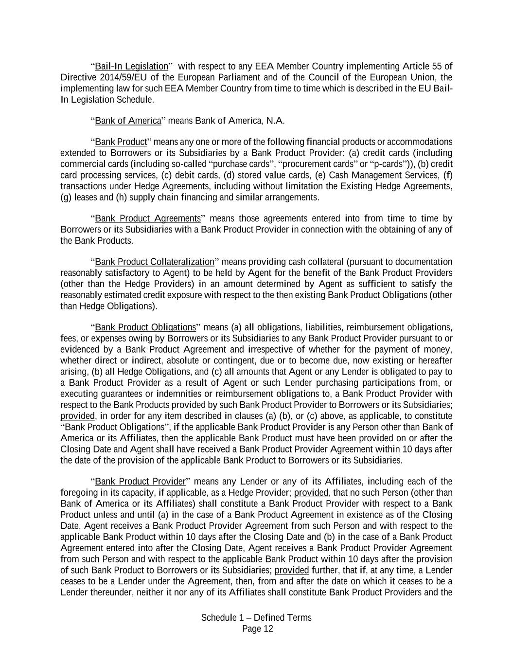 Schedule 1 – Defined Terms Page 12 “Bail-In Legislation” with respect to any EEA Member Country implementing Article 55 of Directive 2014/59/EU of the European Parliament and of the Council of the European Union, the implementing law for such EEA Member Country from time to time which is described in the EU Bail- In Legislation Schedule. “Bank of America” means Bank of America, N.A. “Bank Product” means any one or more of the following financial products or accommodations extended to Borrowers or its Subsidiaries by a Bank Product Provider: (a) credit cards (including commercial cards (including so-called “purchase cards”, “procurement cards” or “p-cards”)), (b) credit card processing services, (c) debit cards, (d) stored value cards, (e) Cash Management Services, (f) transactions under Hedge Agreements, including without limitation the Existing Hedge Agreements, (g) leases and (h) supply chain financing and similar arrangements. “Bank Product Agreements” means those agreements entered into from time to time by Borrowers or its Subsidiaries with a Bank Product Provider in connection with the obtaining of any of the Bank Products. “Bank Product Collateralization” means providing cash collateral (pursuant to documentation reasonably satisfactory to Agent) to be held by Agent for the benefit of the Bank Product Providers (other than the Hedge Providers) in an amount determined by Agent as sufficient to satisfy the reasonably estimated credit exposure with respect to the then existing Bank Product Obligations (other than Hedge Obligations). “Bank Product Obligations” means (a) all obligations, liabilities, reimbursement obligations, fees, or expenses owing by Borrowers or its Subsidiaries to any Bank Product Provider pursuant to or evidenced by a Bank Product Agreement and irrespective of whether for the payment of money, whether direct or indirect, absolute or contingent, due or to become due, now existing or hereafter arising, (b) all Hedge Obligations, and (c) all amounts that Agent or any Lender is obligated to pay to a Bank Product Provider as a result of Agent or such Lender purchasing participations from, or executing guarantees or indemnities or reimbursement obligations to, a Bank Product Provider with respect to the Bank Products provided by such Bank Product Provider to Borrowers or its Subsidiaries; provided, in order for any item described in clauses (a) (b), or (c) above, as applicable, to constitute “Bank Product Obligations”, if the applicable Bank Product Provider is any Person other than Bank of America or its Affiliates, then the applicable Bank Product must have been provided on or after the Closing Date and Agent shall have received a Bank Product Provider Agreement within 10 days after the date of the provision of the applicable Bank Product to Borrowers or its Subsidiaries. “Bank Product Provider” means any Lender or any of its Affiliates, including each of the foregoing in its capacity, if applicable, as a Hedge Provider; provided, that no such Person (other than Bank of America or its Affiliates) shall constitute a Bank Product Provider with respect to a Bank Product unless and until (a) in the case of a Bank Product Agreement in existence as of the Closing Date, Agent receives a Bank Product Provider Agreement from such Person and with respect to the applicable Bank Product within 10 days after the Closing Date and (b) in the case of a Bank Product Agreement entered into after the Closing Date, Agent receives a Bank Product Provider Agreement from such Person and with respect to the applicable Bank Product within 10 days after the provision of such Bank Product to Borrowers or its Subsidiaries; provided further, that if, at any time, a Lender ceases to be a Lender under the Agreement, then, from and after the date on which it ceases to be a Lender thereunder, neither it nor any of its Affiliates shall constitute Bank Product Providers and the