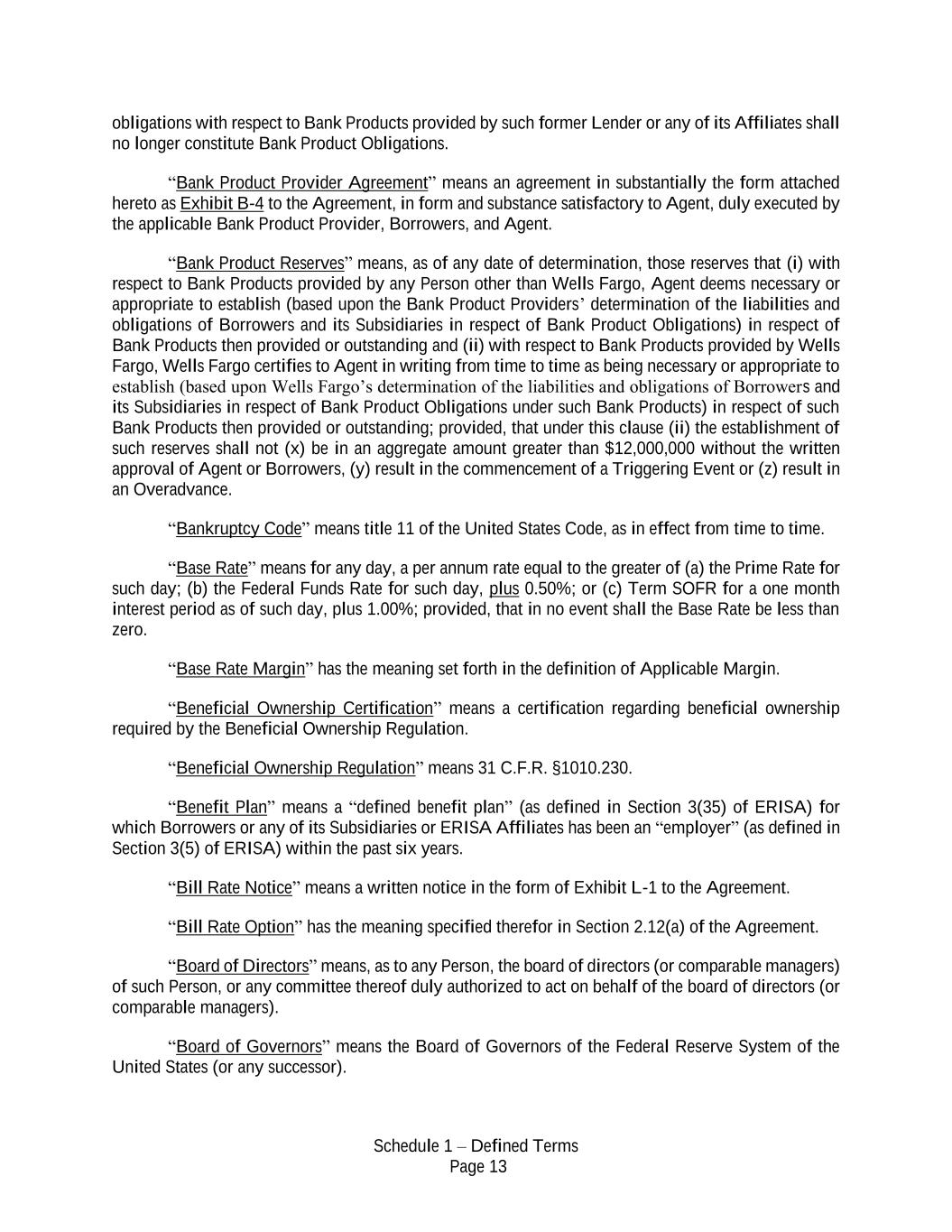 Schedule 1 – Defined Terms Page 13 obligations with respect to Bank Products provided by such former Lender or any of its Affiliates shall no longer constitute Bank Product Obligations. “Bank Product Provider Agreement” means an agreement in substantially the form attached hereto as Exhibit B-4 to the Agreement, in form and substance satisfactory to Agent, duly executed by the applicable Bank Product Provider, Borrowers, and Agent. “Bank Product Reserves” means, as of any date of determination, those reserves that (i) with respect to Bank Products provided by any Person other than Wells Fargo, Agent deems necessary or appropriate to establish (based upon the Bank Product Providers’ determination of the liabilities and obligations of Borrowers and its Subsidiaries in respect of Bank Product Obligations) in respect of Bank Products then provided or outstanding and (ii) with respect to Bank Products provided by Wells Fargo, Wells Fargo certifies to Agent in writing from time to time as being necessary or appropriate to establish (based upon Wells Fargo’s determination of the liabilities and obligations of Borrowers and its Subsidiaries in respect of Bank Product Obligations under such Bank Products) in respect of such Bank Products then provided or outstanding; provided, that under this clause (ii) the establishment of such reserves shall not (x) be in an aggregate amount greater than $12,000,000 without the written approval of Agent or Borrowers, (y) result in the commencement of a Triggering Event or (z) result in an Overadvance. “Bankruptcy Code” means title 11 of the United States Code, as in effect from time to time. “Base Rate” means for any day, a per annum rate equal to the greater of (a) the Prime Rate for such day; (b) the Federal Funds Rate for such day, plus 0.50%; or (c) Term SOFR for a one month interest period as of such day, plus 1.00%; provided, that in no event shall the Base Rate be less than zero. “Base Rate Margin” has the meaning set forth in the definition of Applicable Margin. “Beneficial Ownership Certification” means a certification regarding beneficial ownership required by the Beneficial Ownership Regulation. “Beneficial Ownership Regulation” means 31 C.F.R. §1010.230. “Benefit Plan” means a “defined benefit plan” (as defined in Section 3(35) of ERISA) for which Borrowers or any of its Subsidiaries or ERISA Affiliates has been an “employer” (as defined in Section 3(5) of ERISA) within the past six years. “Bill Rate Notice” means a written notice in the form of Exhibit L-1 to the Agreement. “Bill Rate Option” has the meaning specified therefor in Section 2.12(a) of the Agreement. “Board of Directors” means, as to any Person, the board of directors (or comparable managers) of such Person, or any committee thereof duly authorized to act on behalf of the board of directors (or comparable managers). “Board of Governors” means the Board of Governors of the Federal Reserve System of the United States (or any successor).