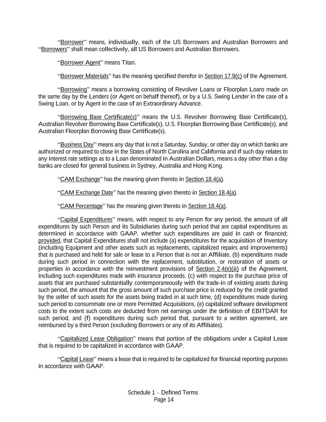 Schedule 1 – Defined Terms Page 14 “Borrower” means, individually, each of the US Borrowers and Australian Borrowers and “Borrowers” shall mean collectively, all US Borrowers and Australian Borrowers. “Borrower Agent” means Titan. “Borrower Materials” has the meaning specified therefor in Section 17.9(c) of the Agreement. “Borrowing” means a borrowing consisting of Revolver Loans or Floorplan Loans made on the same day by the Lenders (or Agent on behalf thereof), or by a U.S. Swing Lender in the case of a Swing Loan, or by Agent in the case of an Extraordinary Advance. “Borrowing Base Certificate(s)” means the U.S. Revolver Borrowing Base Certificate(s), Australian Revolver Borrowing Base Certificate(s), U.S. Floorplan Borrowing Base Certificate(s), and Australian Floorplan Borrowing Base Certificate(s). “Business Day” means any day that is not a Saturday, Sunday, or other day on which banks are authorized or required to close in the States of North Carolina and California and if such day relates to any interest rate settings as to a Loan denominated in Australian Dollars, means a day other than a day banks are closed for general business in Sydney, Australia and Hong Kong. “CAM Exchange” has the meaning given thereto in Section 18.4(a). “CAM Exchange Date” has the meaning given thereto in Section 18.4(a). “CAM Percentage” has the meaning given thereto in Section 18.4(a). “Capital Expenditures” means, with respect to any Person for any period, the amount of all expenditures by such Person and its Subsidiaries during such period that are capital expenditures as determined in accordance with GAAP, whether such expenditures are paid in cash or financed; provided, that Capital Expenditures shall not include (a) expenditures for the acquisition of Inventory (including Equipment and other assets such as replacements, capitalized repairs and improvements) that is purchased and held for sale or lease to a Person that is not an Affiliate, (b) expenditures made during such period in connection with the replacement, substitution, or restoration of assets or properties in accordance with the reinvestment provisions of Section 2.4(e)(ii) of the Agreement, including such expenditures made with insurance proceeds, (c) with respect to the purchase price of assets that are purchased substantially contemporaneously with the trade-in of existing assets during such period, the amount that the gross amount of such purchase price is reduced by the credit granted by the seller of such assets for the assets being traded in at such time, (d) expenditures made during such period to consummate one or more Permitted Acquisitions, (e) capitalized software development costs to the extent such costs are deducted from net earnings under the definition of EBITDAR for such period, and (f) expenditures during such period that, pursuant to a written agreement, are reimbursed by a third Person (excluding Borrowers or any of its Affiliates). “Capitalized Lease Obligation” means that portion of the obligations under a Capital Lease that is required to be capitalized in accordance with GAAP. “Capital Lease” means a lease that is required to be capitalized for financial reporting purposes in accordance with GAAP.