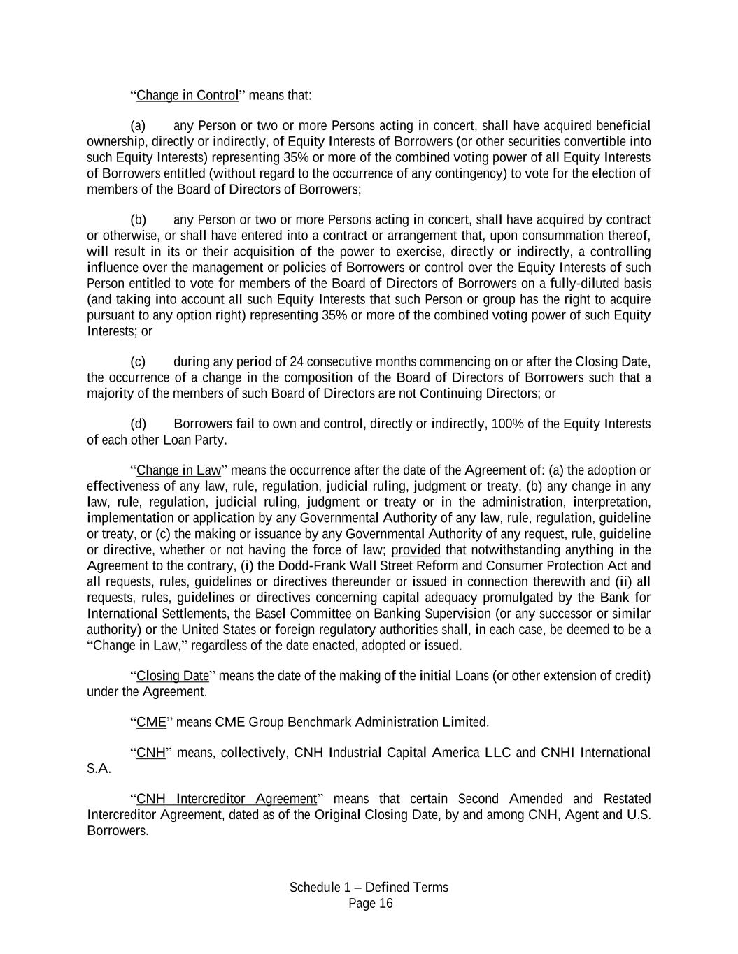 Schedule 1 – Defined Terms Page 16 “Change in Control” means that: (a) any Person or two or more Persons acting in concert, shall have acquired beneficial ownership, directly or indirectly, of Equity Interests of Borrowers (or other securities convertible into such Equity Interests) representing 35% or more of the combined voting power of all Equity Interests of Borrowers entitled (without regard to the occurrence of any contingency) to vote for the election of members of the Board of Directors of Borrowers; (b) any Person or two or more Persons acting in concert, shall have acquired by contract or otherwise, or shall have entered into a contract or arrangement that, upon consummation thereof, will result in its or their acquisition of the power to exercise, directly or indirectly, a controlling influence over the management or policies of Borrowers or control over the Equity Interests of such Person entitled to vote for members of the Board of Directors of Borrowers on a fully-diluted basis (and taking into account all such Equity Interests that such Person or group has the right to acquire pursuant to any option right) representing 35% or more of the combined voting power of such Equity Interests; or (c) during any period of 24 consecutive months commencing on or after the Closing Date, the occurrence of a change in the composition of the Board of Directors of Borrowers such that a majority of the members of such Board of Directors are not Continuing Directors; or (d) Borrowers fail to own and control, directly or indirectly, 100% of the Equity Interests of each other Loan Party. “Change in Law” means the occurrence after the date of the Agreement of: (a) the adoption or effectiveness of any law, rule, regulation, judicial ruling, judgment or treaty, (b) any change in any law, rule, regulation, judicial ruling, judgment or treaty or in the administration, interpretation, implementation or application by any Governmental Authority of any law, rule, regulation, guideline or treaty, or (c) the making or issuance by any Governmental Authority of any request, rule, guideline or directive, whether or not having the force of law; provided that notwithstanding anything in the Agreement to the contrary, (i) the Dodd-Frank Wall Street Reform and Consumer Protection Act and all requests, rules, guidelines or directives thereunder or issued in connection therewith and (ii) all requests, rules, guidelines or directives concerning capital adequacy promulgated by the Bank for International Settlements, the Basel Committee on Banking Supervision (or any successor or similar authority) or the United States or foreign regulatory authorities shall, in each case, be deemed to be a “Change in Law,” regardless of the date enacted, adopted or issued. “Closing Date” means the date of the making of the initial Loans (or other extension of credit) under the Agreement. “CME” means CME Group Benchmark Administration Limited. “CNH” means, collectively, CNH Industrial Capital America LLC and CNHI International S.A. “CNH Intercreditor Agreement” means that certain Second Amended and Restated Intercreditor Agreement, dated as of the Original Closing Date, by and among CNH, Agent and U.S. Borrowers.