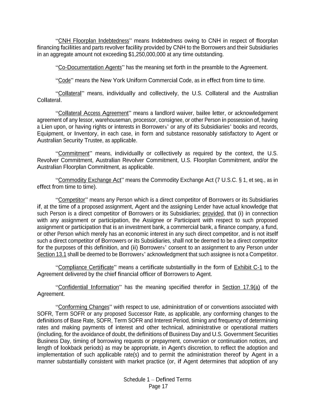 Schedule 1 – Defined Terms Page 17 “CNH Floorplan Indebtedness” means Indebtedness owing to CNH in respect of floorplan financing facilities and parts revolver facility provided by CNH to the Borrowers and their Subsidiaries in an aggregate amount not exceeding $1,250,000,000 at any time outstanding. “Co-Documentation Agents” has the meaning set forth in the preamble to the Agreement. “Code” means the New York Uniform Commercial Code, as in effect from time to time. “Collateral” means, individually and collectively, the U.S. Collateral and the Australian Collateral. “Collateral Access Agreement” means a landlord waiver, bailee letter, or acknowledgement agreement of any lessor, warehouseman, processor, consignee, or other Person in possession of, having a Lien upon, or having rights or interests in Borrowers’ or any of its Subsidiaries’ books and records, Equipment, or Inventory, in each case, in form and substance reasonably satisfactory to Agent or Australian Security Trustee, as applicable. “Commitment” means, individually or collectively as required by the context, the U.S. Revolver Commitment, Australian Revolver Commitment, U.S. Floorplan Commitment, and/or the Australian Floorplan Commitment, as applicable. “Commodity Exchange Act” means the Commodity Exchange Act (7 U.S.C. § 1, et seq., as in effect from time to time). “Competitor” means any Person which is a direct competitor of Borrowers or its Subsidiaries if, at the time of a proposed assignment, Agent and the assigning Lender have actual knowledge that such Person is a direct competitor of Borrowers or its Subsidiaries; provided, that (i) in connection with any assignment or participation, the Assignee or Participant with respect to such proposed assignment or participation that is an investment bank, a commercial bank, a finance company, a fund, or other Person which merely has an economic interest in any such direct competitor, and is not itself such a direct competitor of Borrowers or its Subsidiaries, shall not be deemed to be a direct competitor for the purposes of this definition, and (ii) Borrowers’ consent to an assignment to any Person under Section 13.1 shall be deemed to be Borrowers’ acknowledgment that such assignee is not a Competitor. “Compliance Certificate” means a certificate substantially in the form of Exhibit C-1 to the Agreement delivered by the chief financial officer of Borrowers to Agent. “Confidential Information” has the meaning specified therefor in Section 17.9(a) of the Agreement. “Conforming Changes” with respect to use, administration of or conventions associated with SOFR, Term SOFR or any proposed Successor Rate, as applicable, any conforming changes to the definitions of Base Rate, SOFR, Term SOFR and Interest Period, timing and frequency of determining rates and making payments of interest and other technical, administrative or operational matters (including, for the avoidance of doubt, the definitions of Business Day and U.S. Government Securities Business Day, timing of borrowing requests or prepayment, conversion or continuation notices, and length of lookback periods) as may be appropriate, in Agent's discretion, to reflect the adoption and implementation of such applicable rate(s) and to permit the administration thereof by Agent in a manner substantially consistent with market practice (or, if Agent determines that adoption of any