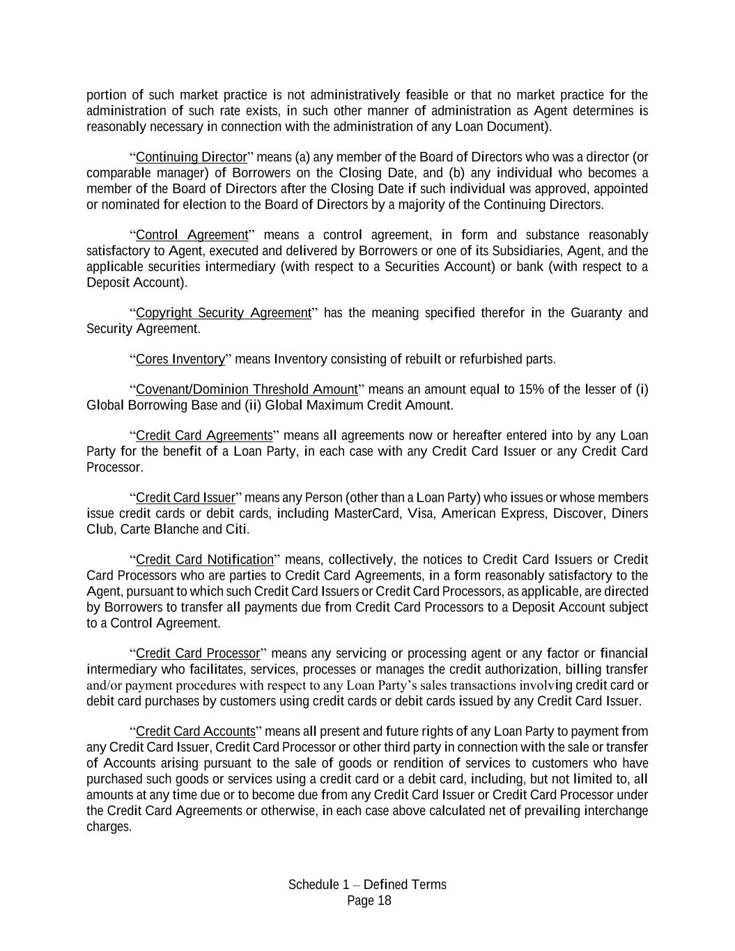Schedule 1 – Defined Terms Page 18 portion of such market practice is not administratively feasible or that no market practice for the administration of such rate exists, in such other manner of administration as Agent determines is reasonably necessary in connection with the administration of any Loan Document). “Continuing Director” means (a) any member of the Board of Directors who was a director (or comparable manager) of Borrowers on the Closing Date, and (b) any individual who becomes a member of the Board of Directors after the Closing Date if such individual was approved, appointed or nominated for election to the Board of Directors by a majority of the Continuing Directors. “Control Agreement” means a control agreement, in form and substance reasonably satisfactory to Agent, executed and delivered by Borrowers or one of its Subsidiaries, Agent, and the applicable securities intermediary (with respect to a Securities Account) or bank (with respect to a Deposit Account). “Copyright Security Agreement” has the meaning specified therefor in the Guaranty and Security Agreement. “Cores Inventory” means Inventory consisting of rebuilt or refurbished parts. “Covenant/Dominion Threshold Amount” means an amount equal to 15% of the lesser of (i) Global Borrowing Base and (ii) Global Maximum Credit Amount. “Credit Card Agreements” means all agreements now or hereafter entered into by any Loan Party for the benefit of a Loan Party, in each case with any Credit Card Issuer or any Credit Card Processor. “Credit Card Issuer” means any Person (other than a Loan Party) who issues or whose members issue credit cards or debit cards, including MasterCard, Visa, American Express, Discover, Diners Club, Carte Blanche and Citi. “Credit Card Notification” means, collectively, the notices to Credit Card Issuers or Credit Card Processors who are parties to Credit Card Agreements, in a form reasonably satisfactory to the Agent, pursuant to which such Credit Card Issuers or Credit Card Processors, as applicable, are directed by Borrowers to transfer all payments due from Credit Card Processors to a Deposit Account subject to a Control Agreement. “Credit Card Processor” means any servicing or processing agent or any factor or financial intermediary who facilitates, services, processes or manages the credit authorization, billing transfer and/or payment procedures with respect to any Loan Party’s sales transactions involving credit card or debit card purchases by customers using credit cards or debit cards issued by any Credit Card Issuer. “Credit Card Accounts” means all present and future rights of any Loan Party to payment from any Credit Card Issuer, Credit Card Processor or other third party in connection with the sale or transfer of Accounts arising pursuant to the sale of goods or rendition of services to customers who have purchased such goods or services using a credit card or a debit card, including, but not limited to, all amounts at any time due or to become due from any Credit Card Issuer or Credit Card Processor under the Credit Card Agreements or otherwise, in each case above calculated net of prevailing interchange charges.