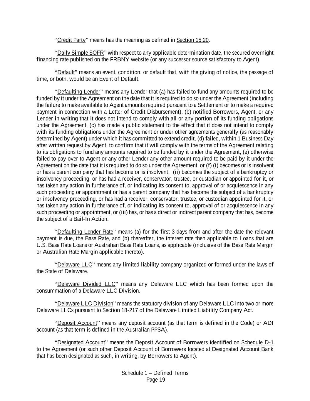 Schedule 1 – Defined Terms Page 19 “Credit Party” means has the meaning as defined in Section 15.20. “Daily Simple SOFR” with respect to any applicable determination date, the secured overnight financing rate published on the FRBNY website (or any successor source satisfactory to Agent). “Default” means an event, condition, or default that, with the giving of notice, the passage of time, or both, would be an Event of Default. “Defaulting Lender” means any Lender that (a) has failed to fund any amounts required to be funded by it under the Agreement on the date that it is required to do so under the Agreement (including the failure to make available to Agent amounts required pursuant to a Settlement or to make a required payment in connection with a Letter of Credit Disbursement), (b) notified Borrowers, Agent, or any Lender in writing that it does not intend to comply with all or any portion of its funding obligations under the Agreement, (c) has made a public statement to the effect that it does not intend to comply with its funding obligations under the Agreement or under other agreements generally (as reasonably determined by Agent) under which it has committed to extend credit, (d) failed, within 1 Business Day after written request by Agent, to confirm that it will comply with the terms of the Agreement relating to its obligations to fund any amounts required to be funded by it under the Agreement, (e) otherwise failed to pay over to Agent or any other Lender any other amount required to be paid by it under the Agreement on the date that it is required to do so under the Agreement, or (f) (i) becomes or is insolvent or has a parent company that has become or is insolvent, (ii) becomes the subject of a bankruptcy or insolvency proceeding, or has had a receiver, conservator, trustee, or custodian or appointed for it, or has taken any action in furtherance of, or indicating its consent to, approval of or acquiescence in any such proceeding or appointment or has a parent company that has become the subject of a bankruptcy or insolvency proceeding, or has had a receiver, conservator, trustee, or custodian appointed for it, or has taken any action in furtherance of, or indicating its consent to, approval of or acquiescence in any such proceeding or appointment, or (iii) has, or has a direct or indirect parent company that has, become the subject of a Bail-In Action. “Defaulting Lender Rate” means (a) for the first 3 days from and after the date the relevant payment is due, the Base Rate, and (b) thereafter, the interest rate then applicable to Loans that are U.S. Base Rate Loans or Australian Base Rate Loans, as applicable (inclusive of the Base Rate Margin or Australian Rate Margin applicable thereto). “Delaware LLC” means any limited liability company organized or formed under the laws of the State of Delaware. “Delaware Divided LLC” means any Delaware LLC which has been formed upon the consummation of a Delaware LLC Division. “Delaware LLC Division” means the statutory division of any Delaware LLC into two or more Delaware LLCs pursuant to Section 18-217 of the Delaware Limited Liability Company Act. “Deposit Account” means any deposit account (as that term is defined in the Code) or ADI account (as that term is defined in the Australian PPSA). “Designated Account” means the Deposit Account of Borrowers identified on Schedule D-1 to the Agreement (or such other Deposit Account of Borrowers located at Designated Account Bank that has been designated as such, in writing, by Borrowers to Agent).