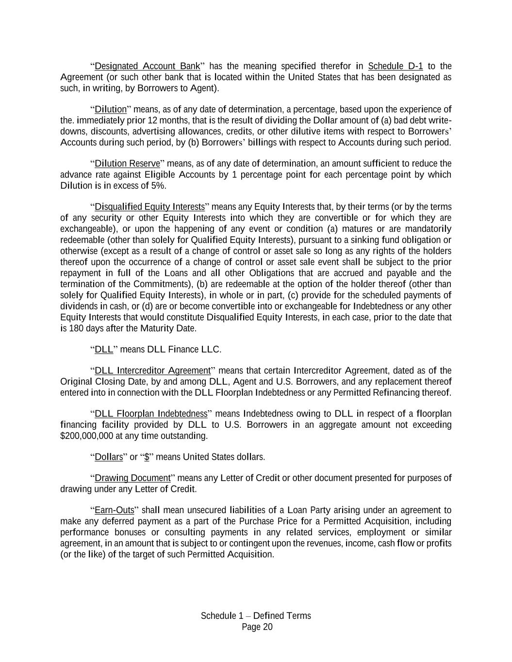 Schedule 1 – Defined Terms Page 20 “Designated Account Bank” has the meaning specified therefor in Schedule D-1 to the Agreement (or such other bank that is located within the United States that has been designated as such, in writing, by Borrowers to Agent). “Dilution” means, as of any date of determination, a percentage, based upon the experience of the. immediately prior 12 months, that is the result of dividing the Dollar amount of (a) bad debt write- downs, discounts, advertising allowances, credits, or other dilutive items with respect to Borrowers’ Accounts during such period, by (b) Borrowers’ billings with respect to Accounts during such period. “Dilution Reserve” means, as of any date of determination, an amount sufficient to reduce the advance rate against Eligible Accounts by 1 percentage point for each percentage point by which Dilution is in excess of 5%. “Disqualified Equity Interests” means any Equity Interests that, by their terms (or by the terms of any security or other Equity Interests into which they are convertible or for which they are exchangeable), or upon the happening of any event or condition (a) matures or are mandatorily redeemable (other than solely for Qualified Equity Interests), pursuant to a sinking fund obligation or otherwise (except as a result of a change of control or asset sale so long as any rights of the holders thereof upon the occurrence of a change of control or asset sale event shall be subject to the prior repayment in full of the Loans and all other Obligations that are accrued and payable and the termination of the Commitments), (b) are redeemable at the option of the holder thereof (other than solely for Qualified Equity Interests), in whole or in part, (c) provide for the scheduled payments of dividends in cash, or (d) are or become convertible into or exchangeable for Indebtedness or any other Equity Interests that would constitute Disqualified Equity Interests, in each case, prior to the date that is 180 days after the Maturity Date. “DLL” means DLL Finance LLC. “DLL Intercreditor Agreement” means that certain Intercreditor Agreement, dated as of the Original Closing Date, by and among DLL, Agent and U.S. Borrowers, and any replacement thereof entered into in connection with the DLL Floorplan Indebtedness or any Permitted Refinancing thereof. “DLL Floorplan Indebtedness” means Indebtedness owing to DLL in respect of a floorplan financing facility provided by DLL to U.S. Borrowers in an aggregate amount not exceeding $200,000,000 at any time outstanding. “Dollars” or “$” means United States dollars. “Drawing Document” means any Letter of Credit or other document presented for purposes of drawing under any Letter of Credit. “Earn-Outs” shall mean unsecured liabilities of a Loan Party arising under an agreement to make any deferred payment as a part of the Purchase Price for a Permitted Acquisition, including performance bonuses or consulting payments in any related services, employment or similar agreement, in an amount that is subject to or contingent upon the revenues, income, cash flow or profits (or the like) of the target of such Permitted Acquisition.