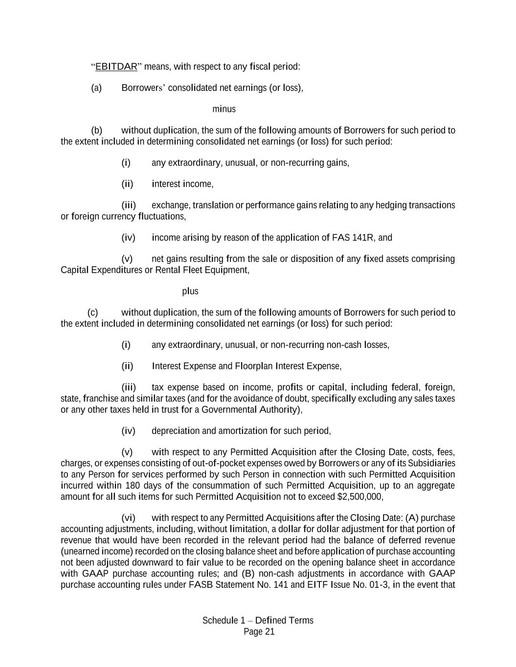 Schedule 1 – Defined Terms Page 21 “EBITDAR” means, with respect to any fiscal period: (a) Borrowers’ consolidated net earnings (or loss), minus (b) without duplication, the sum of the following amounts of Borrowers for such period to the extent included in determining consolidated net earnings (or loss) for such period: (i) any extraordinary, unusual, or non-recurring gains, (ii) interest income, (iii) exchange, translation or performance gains relating to any hedging transactions or foreign currency fluctuations, (iv) income arising by reason of the application of FAS 141R, and (v) net gains resulting from the sale or disposition of any fixed assets comprising Capital Expenditures or Rental Fleet Equipment, plus (c) without duplication, the sum of the following amounts of Borrowers for such period to the extent included in determining consolidated net earnings (or loss) for such period: (i) any extraordinary, unusual, or non-recurring non-cash losses, (ii) Interest Expense and Floorplan Interest Expense, (iii) tax expense based on income, profits or capital, including federal, foreign, state, franchise and similar taxes (and for the avoidance of doubt, specifically excluding any sales taxes or any other taxes held in trust for a Governmental Authority), (iv) depreciation and amortization for such period, (v) with respect to any Permitted Acquisition after the Closing Date, costs, fees, charges, or expenses consisting of out-of-pocket expenses owed by Borrowers or any of its Subsidiaries to any Person for services performed by such Person in connection with such Permitted Acquisition incurred within 180 days of the consummation of such Permitted Acquisition, up to an aggregate amount for all such items for such Permitted Acquisition not to exceed $2,500,000, (vi) with respect to any Permitted Acquisitions after the Closing Date: (A) purchase accounting adjustments, including, without limitation, a dollar for dollar adjustment for that portion of revenue that would have been recorded in the relevant period had the balance of deferred revenue (unearned income) recorded on the closing balance sheet and before application of purchase accounting not been adjusted downward to fair value to be recorded on the opening balance sheet in accordance with GAAP purchase accounting rules; and (B) non-cash adjustments in accordance with GAAP purchase accounting rules under FASB Statement No. 141 and EITF Issue No. 01-3, in the event that