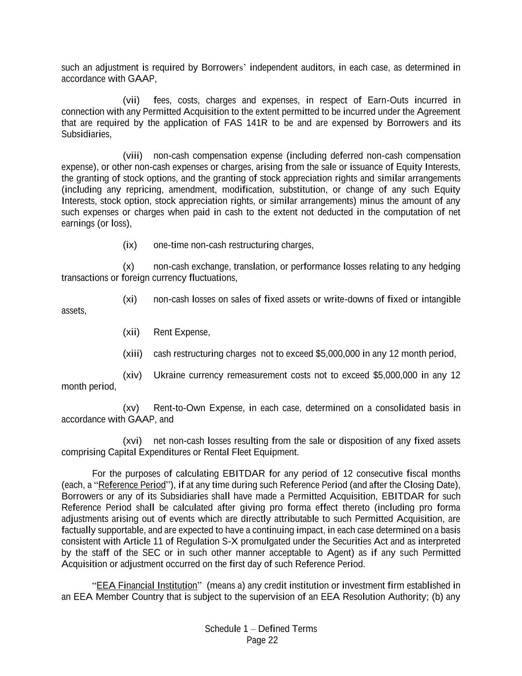 Schedule 1 – Defined Terms Page 22 such an adjustment is required by Borrowers’ independent auditors, in each case, as determined in accordance with GAAP, (vii) fees, costs, charges and expenses, in respect of Earn-Outs incurred in connection with any Permitted Acquisition to the extent permitted to be incurred under the Agreement that are required by the application of FAS 141R to be and are expensed by Borrowers and its Subsidiaries, (viii) non-cash compensation expense (including deferred non-cash compensation expense), or other non-cash expenses or charges, arising from the sale or issuance of Equity Interests, the granting of stock options, and the granting of stock appreciation rights and similar arrangements (including any repricing, amendment, modification, substitution, or change of any such Equity Interests, stock option, stock appreciation rights, or similar arrangements) minus the amount of any such expenses or charges when paid in cash to the extent not deducted in the computation of net earnings (or loss), (ix) one-time non-cash restructuring charges, (x) non-cash exchange, translation, or performance losses relating to any hedging transactions or foreign currency fluctuations, (xi) non-cash losses on sales of fixed assets or write-downs of fixed or intangible assets, (xii) Rent Expense, (xiii) cash restructuring charges not to exceed $5,000,000 in any 12 month period, (xiv) Ukraine currency remeasurement costs not to exceed $5,000,000 in any 12 month period, (xv) Rent-to-Own Expense, in each case, determined on a consolidated basis in accordance with GAAP, and (xvi) net non-cash losses resulting from the sale or disposition of any fixed assets comprising Capital Expenditures or Rental Fleet Equipment. For the purposes of calculating EBITDAR for any period of 12 consecutive fiscal months (each, a “Reference Period”), if at any time during such Reference Period (and after the Closing Date), Borrowers or any of its Subsidiaries shall have made a Permitted Acquisition, EBITDAR for such Reference Period shall be calculated after giving pro forma effect thereto (including pro forma adjustments arising out of events which are directly attributable to such Permitted Acquisition, are factually supportable, and are expected to have a continuing impact, in each case determined on a basis consistent with Article 11 of Regulation S-X promulgated under the Securities Act and as interpreted by the staff of the SEC or in such other manner acceptable to Agent) as if any such Permitted Acquisition or adjustment occurred on the first day of such Reference Period. “EEA Financial Institution” (means a) any credit institution or investment firm established in an EEA Member Country that is subject to the supervision of an EEA Resolution Authority; (b) any