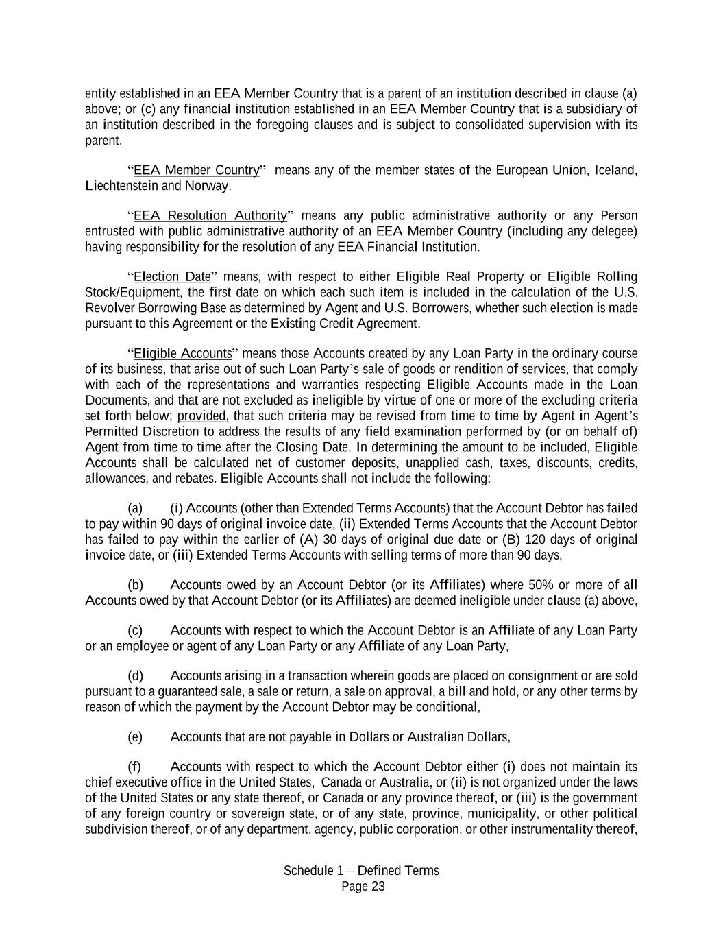 Schedule 1 – Defined Terms Page 23 entity established in an EEA Member Country that is a parent of an institution described in clause (a) above; or (c) any financial institution established in an EEA Member Country that is a subsidiary of an institution described in the foregoing clauses and is subject to consolidated supervision with its parent. “EEA Member Country” means any of the member states of the European Union, Iceland, Liechtenstein and Norway. “EEA Resolution Authority” means any public administrative authority or any Person entrusted with public administrative authority of an EEA Member Country (including any delegee) having responsibility for the resolution of any EEA Financial Institution. “Election Date” means, with respect to either Eligible Real Property or Eligible Rolling Stock/Equipment, the first date on which each such item is included in the calculation of the U.S. Revolver Borrowing Base as determined by Agent and U.S. Borrowers, whether such election is made pursuant to this Agreement or the Existing Credit Agreement. “Eligible Accounts” means those Accounts created by any Loan Party in the ordinary course of its business, that arise out of such Loan Party’s sale of goods or rendition of services, that comply with each of the representations and warranties respecting Eligible Accounts made in the Loan Documents, and that are not excluded as ineligible by virtue of one or more of the excluding criteria set forth below; provided, that such criteria may be revised from time to time by Agent in Agent’s Permitted Discretion to address the results of any field examination performed by (or on behalf of) Agent from time to time after the Closing Date. In determining the amount to be included, Eligible Accounts shall be calculated net of customer deposits, unapplied cash, taxes, discounts, credits, allowances, and rebates. Eligible Accounts shall not include the following: (a) (i) Accounts (other than Extended Terms Accounts) that the Account Debtor has failed to pay within 90 days of original invoice date, (ii) Extended Terms Accounts that the Account Debtor has failed to pay within the earlier of (A) 30 days of original due date or (B) 120 days of original invoice date, or (iii) Extended Terms Accounts with selling terms of more than 90 days, (b) Accounts owed by an Account Debtor (or its Affiliates) where 50% or more of all Accounts owed by that Account Debtor (or its Affiliates) are deemed ineligible under clause (a) above, (c) Accounts with respect to which the Account Debtor is an Affiliate of any Loan Party or an employee or agent of any Loan Party or any Affiliate of any Loan Party, (d) Accounts arising in a transaction wherein goods are placed on consignment or are sold pursuant to a guaranteed sale, a sale or return, a sale on approval, a bill and hold, or any other terms by reason of which the payment by the Account Debtor may be conditional, (e) Accounts that are not payable in Dollars or Australian Dollars, (f) Accounts with respect to which the Account Debtor either (i) does not maintain its chief executive office in the United States, Canada or Australia, or (ii) is not organized under the laws of the United States or any state thereof, or Canada or any province thereof, or (iii) is the government of any foreign country or sovereign state, or of any state, province, municipality, or other political subdivision thereof, or of any department, agency, public corporation, or other instrumentality thereof,