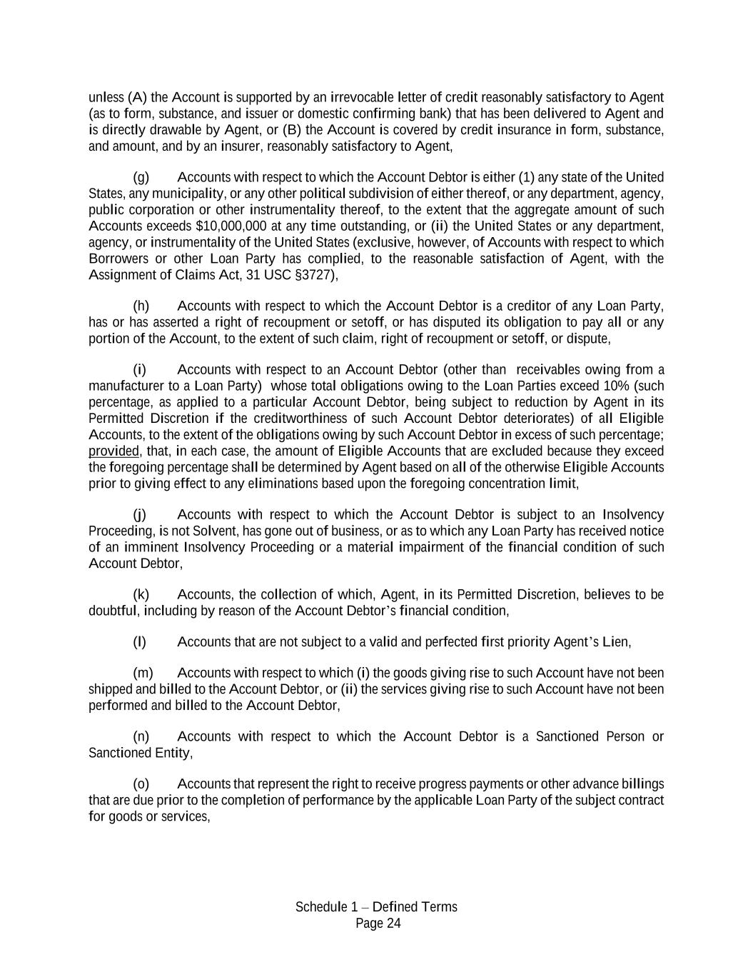 Schedule 1 – Defined Terms Page 24 unless (A) the Account is supported by an irrevocable letter of credit reasonably satisfactory to Agent (as to form, substance, and issuer or domestic confirming bank) that has been delivered to Agent and is directly drawable by Agent, or (B) the Account is covered by credit insurance in form, substance, and amount, and by an insurer, reasonably satisfactory to Agent, (g) Accounts with respect to which the Account Debtor is either (1) any state of the United States, any municipality, or any other political subdivision of either thereof, or any department, agency, public corporation or other instrumentality thereof, to the extent that the aggregate amount of such Accounts exceeds $10,000,000 at any time outstanding, or (ii) the United States or any department, agency, or instrumentality of the United States (exclusive, however, of Accounts with respect to which Borrowers or other Loan Party has complied, to the reasonable satisfaction of Agent, with the Assignment of Claims Act, 31 USC §3727), (h) Accounts with respect to which the Account Debtor is a creditor of any Loan Party, has or has asserted a right of recoupment or setoff, or has disputed its obligation to pay all or any portion of the Account, to the extent of such claim, right of recoupment or setoff, or dispute, (i) Accounts with respect to an Account Debtor (other than receivables owing from a manufacturer to a Loan Party) whose total obligations owing to the Loan Parties exceed 10% (such percentage, as applied to a particular Account Debtor, being subject to reduction by Agent in its Permitted Discretion if the creditworthiness of such Account Debtor deteriorates) of all Eligible Accounts, to the extent of the obligations owing by such Account Debtor in excess of such percentage; provided, that, in each case, the amount of Eligible Accounts that are excluded because they exceed the foregoing percentage shall be determined by Agent based on all of the otherwise Eligible Accounts prior to giving effect to any eliminations based upon the foregoing concentration limit, (j) Accounts with respect to which the Account Debtor is subject to an Insolvency Proceeding, is not Solvent, has gone out of business, or as to which any Loan Party has received notice of an imminent Insolvency Proceeding or a material impairment of the financial condition of such Account Debtor, (k) Accounts, the collection of which, Agent, in its Permitted Discretion, believes to be doubtful, including by reason of the Account Debtor’s financial condition, (l) Accounts that are not subject to a valid and perfected first priority Agent’s Lien, (m) Accounts with respect to which (i) the goods giving rise to such Account have not been shipped and billed to the Account Debtor, or (ii) the services giving rise to such Account have not been performed and billed to the Account Debtor, (n) Accounts with respect to which the Account Debtor is a Sanctioned Person or Sanctioned Entity, (o) Accounts that represent the right to receive progress payments or other advance billings that are due prior to the completion of performance by the applicable Loan Party of the subject contract for goods or services,