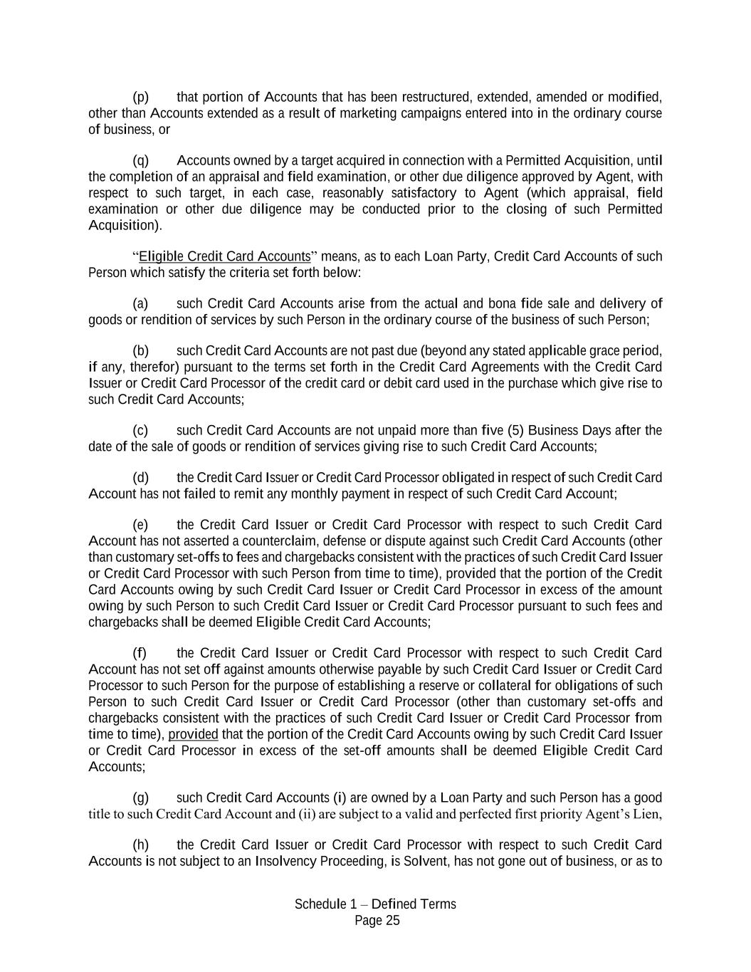 Schedule 1 – Defined Terms Page 25 (p) that portion of Accounts that has been restructured, extended, amended or modified, other than Accounts extended as a result of marketing campaigns entered into in the ordinary course of business, or (q) Accounts owned by a target acquired in connection with a Permitted Acquisition, until the completion of an appraisal and field examination, or other due diligence approved by Agent, with respect to such target, in each case, reasonably satisfactory to Agent (which appraisal, field examination or other due diligence may be conducted prior to the closing of such Permitted Acquisition). “Eligible Credit Card Accounts” means, as to each Loan Party, Credit Card Accounts of such Person which satisfy the criteria set forth below: (a) such Credit Card Accounts arise from the actual and bona fide sale and delivery of goods or rendition of services by such Person in the ordinary course of the business of such Person; (b) such Credit Card Accounts are not past due (beyond any stated applicable grace period, if any, therefor) pursuant to the terms set forth in the Credit Card Agreements with the Credit Card Issuer or Credit Card Processor of the credit card or debit card used in the purchase which give rise to such Credit Card Accounts; (c) such Credit Card Accounts are not unpaid more than five (5) Business Days after the date of the sale of goods or rendition of services giving rise to such Credit Card Accounts; (d) the Credit Card Issuer or Credit Card Processor obligated in respect of such Credit Card Account has not failed to remit any monthly payment in respect of such Credit Card Account; (e) the Credit Card Issuer or Credit Card Processor with respect to such Credit Card Account has not asserted a counterclaim, defense or dispute against such Credit Card Accounts (other than customary set-offs to fees and chargebacks consistent with the practices of such Credit Card Issuer or Credit Card Processor with such Person from time to time), provided that the portion of the Credit Card Accounts owing by such Credit Card Issuer or Credit Card Processor in excess of the amount owing by such Person to such Credit Card Issuer or Credit Card Processor pursuant to such fees and chargebacks shall be deemed Eligible Credit Card Accounts; (f) the Credit Card Issuer or Credit Card Processor with respect to such Credit Card Account has not set off against amounts otherwise payable by such Credit Card Issuer or Credit Card Processor to such Person for the purpose of establishing a reserve or collateral for obligations of such Person to such Credit Card Issuer or Credit Card Processor (other than customary set-offs and chargebacks consistent with the practices of such Credit Card Issuer or Credit Card Processor from time to time), provided that the portion of the Credit Card Accounts owing by such Credit Card Issuer or Credit Card Processor in excess of the set-off amounts shall be deemed Eligible Credit Card Accounts; (g) such Credit Card Accounts (i) are owned by a Loan Party and such Person has a good title to such Credit Card Account and (ii) are subject to a valid and perfected first priority Agent’s Lien, (h) the Credit Card Issuer or Credit Card Processor with respect to such Credit Card Accounts is not subject to an Insolvency Proceeding, is Solvent, has not gone out of business, or as to