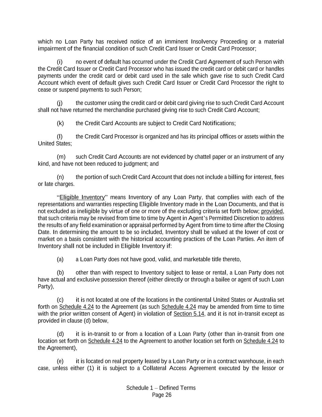 Schedule 1 – Defined Terms Page 26 which no Loan Party has received notice of an imminent Insolvency Proceeding or a material impairment of the financial condition of such Credit Card Issuer or Credit Card Processor; (i) no event of default has occurred under the Credit Card Agreement of such Person with the Credit Card Issuer or Credit Card Processor who has issued the credit card or debit card or handles payments under the credit card or debit card used in the sale which gave rise to such Credit Card Account which event of default gives such Credit Card Issuer or Credit Card Processor the right to cease or suspend payments to such Person; (j) the customer using the credit card or debit card giving rise to such Credit Card Account shall not have returned the merchandise purchased giving rise to such Credit Card Account; (k) the Credit Card Accounts are subject to Credit Card Notifications; (l) the Credit Card Processor is organized and has its principal offices or assets within the United States; (m) such Credit Card Accounts are not evidenced by chattel paper or an instrument of any kind, and have not been reduced to judgment; and (n) the portion of such Credit Card Account that does not include a billing for interest, fees or late charges. “Eligible Inventory” means Inventory of any Loan Party, that complies with each of the representations and warranties respecting Eligible Inventory made in the Loan Documents, and that is not excluded as ineligible by virtue of one or more of the excluding criteria set forth below; provided, that such criteria may be revised from time to time by Agent in Agent’s Permitted Discretion to address the results of any field examination or appraisal performed by Agent from time to time after the Closing Date. In determining the amount to be so included, Inventory shall be valued at the lower of cost or market on a basis consistent with the historical accounting practices of the Loan Parties. An item of Inventory shall not be included in Eligible Inventory if: (a) a Loan Party does not have good, valid, and marketable title thereto, (b) other than with respect to Inventory subject to lease or rental, a Loan Party does not have actual and exclusive possession thereof (either directly or through a bailee or agent of such Loan Party), (c) it is not located at one of the locations in the continental United States or Australia set forth on Schedule 4.24 to the Agreement (as such Schedule 4.24 may be amended from time to time with the prior written consent of Agent) in violation of Section 5.14, and it is not in-transit except as provided in clause (d) below, (d) it is in-transit to or from a location of a Loan Party (other than in-transit from one location set forth on Schedule 4.24 to the Agreement to another location set forth on Schedule 4.24 to the Agreement), (e) it is located on real property leased by a Loan Party or in a contract warehouse, in each case, unless either (1) it is subject to a Collateral Access Agreement executed by the lessor or