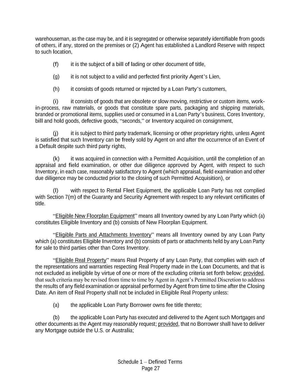 Schedule 1 – Defined Terms Page 27 warehouseman, as the case may be, and it is segregated or otherwise separately identifiable from goods of others, if any, stored on the premises or (2) Agent has established a Landlord Reserve with respect to such location, (f) it is the subject of a bill of lading or other document of title, (g) it is not subject to a valid and perfected first priority Agent’s Lien, (h) it consists of goods returned or rejected by a Loan Party’s customers, (i) it consists of goods that are obsolete or slow moving, restrictive or custom items, work- in-process, raw materials, or goods that constitute spare parts, packaging and shipping materials, branded or promotional items, supplies used or consumed in a Loan Party’s business, Cores Inventory, bill and hold goods, defective goods, “seconds,” or Inventory acquired on consignment, (j) it is subject to third party trademark, licensing or other proprietary rights, unless Agent is satisfied that such Inventory can be freely sold by Agent on and after the occurrence of an Event of a Default despite such third party rights, (k) it was acquired in connection with a Permitted Acquisition, until the completion of an appraisal and field examination, or other due diligence approved by Agent, with respect to such Inventory, in each case, reasonably satisfactory to Agent (which appraisal, field examination and other due diligence may be conducted prior to the closing of such Permitted Acquisition), or (l) with respect to Rental Fleet Equipment, the applicable Loan Party has not complied with Section 7(m) of the Guaranty and Security Agreement with respect to any relevant certificates of title. “Eligible New Floorplan Equipment” means all Inventory owned by any Loan Party which (a) constitutes Eligible Inventory and (b) consists of New Floorplan Equipment. “Eligible Parts and Attachments Inventory” means all Inventory owned by any Loan Party which (a) constitutes Eligible Inventory and (b) consists of parts or attachments held by any Loan Party for sale to third parties other than Cores Inventory. “Eligible Real Property” means Real Property of any Loan Party, that complies with each of the representations and warranties respecting Real Property made in the Loan Documents, and that is not excluded as ineligible by virtue of one or more of the excluding criteria set forth below; provided, that such criteria may be revised from time to time by Agent in Agent’s Permitted Discretion to address the results of any field examination or appraisal performed by Agent from time to time after the Closing Date. An item of Real Property shall not be included in Eligible Real Property unless: (a) the applicable Loan Party Borrower owns fee title thereto; (b) the applicable Loan Party has executed and delivered to the Agent such Mortgages and other documents as the Agent may reasonably request; provided, that no Borrower shall have to deliver any Mortgage outside the U.S. or Australia;