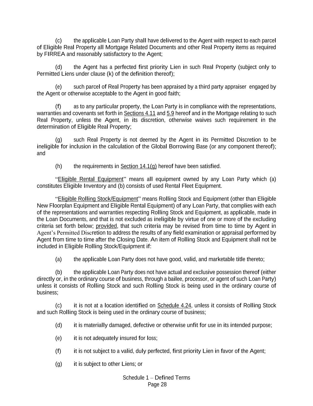 Schedule 1 – Defined Terms Page 28 (c) the applicable Loan Party shall have delivered to the Agent with respect to each parcel of Eligible Real Property all Mortgage Related Documents and other Real Property items as required by FIRREA and reasonably satisfactory to the Agent; (d) the Agent has a perfected first priority Lien in such Real Property (subject only to Permitted Liens under clause (k) of the definition thereof); (e) such parcel of Real Property has been appraised by a third party appraiser engaged by the Agent or otherwise acceptable to the Agent in good faith; (f) as to any particular property, the Loan Party is in compliance with the representations, warranties and covenants set forth in Sections 4.11 and 5.9 hereof and in the Mortgage relating to such Real Property, unless the Agent, in its discretion, otherwise waives such requirement in the determination of Eligible Real Property; (g) such Real Property is not deemed by the Agent in its Permitted Discretion to be ineligible for inclusion in the calculation of the Global Borrowing Base (or any component thereof); and (h) the requirements in Section 14.1(g) hereof have been satisfied. “Eligible Rental Equipment” means all equipment owned by any Loan Party which (a) constitutes Eligible Inventory and (b) consists of used Rental Fleet Equipment. “Eligible Rolling Stock/Equipment” means Rolling Stock and Equipment (other than Eligible New Floorplan Equipment and Eligible Rental Equipment) of any Loan Party, that complies with each of the representations and warranties respecting Rolling Stock and Equipment, as applicable, made in the Loan Documents, and that is not excluded as ineligible by virtue of one or more of the excluding criteria set forth below; provided, that such criteria may be revised from time to time by Agent in Agent’s Permitted Discretion to address the results of any field examination or appraisal performed by Agent from time to time after the Closing Date. An item of Rolling Stock and Equipment shall not be included in Eligible Rolling Stock/Equipment if: (a) the applicable Loan Party does not have good, valid, and marketable title thereto; (b) the applicable Loan Party does not have actual and exclusive possession thereof (either directly or, in the ordinary course of business, through a bailee, processor, or agent of such Loan Party) unless it consists of Rolling Stock and such Rolling Stock is being used in the ordinary course of business; (c) it is not at a location identified on Schedule 4.24, unless it consists of Rolling Stock and such Rolling Stock is being used in the ordinary course of business; (d) it is materially damaged, defective or otherwise unfit for use in its intended purpose; (e) it is not adequately insured for loss; (f) it is not subject to a valid, duly perfected, first priority Lien in favor of the Agent; (g) it is subject to other Liens; or