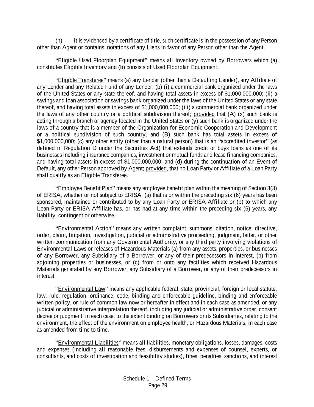 Schedule 1 – Defined Terms Page 29 (h) it is evidenced by a certificate of title, such certificate is in the possession of any Person other than Agent or contains notations of any Liens in favor of any Person other than the Agent. “Eligible Used Floorplan Equipment” means all Inventory owned by Borrowers which (a) constitutes Eligible Inventory and (b) consists of Used Floorplan Equipment. “Eligible Transferee” means (a) any Lender (other than a Defaulting Lender), any Affiliate of any Lender and any Related Fund of any Lender; (b) (i) a commercial bank organized under the laws of the United States or any state thereof, and having total assets in excess of $1,000,000,000; (ii) a savings and loan association or savings bank organized under the laws of the United States or any state thereof, and having total assets in excess of $1,000,000,000; (iii) a commercial bank organized under the laws of any other country or a political subdivision thereof; provided that (A) (x) such bank is acting through a branch or agency located in the United States or (y) such bank is organized under the laws of a country that is a member of the Organization for Economic Cooperation and Development or a political subdivision of such country, and (B) such bank has total assets in excess of $1,000,000,000; (c) any other entity (other than a natural person) that is an “accredited investor” (as defined in Regulation D under the Securities Act) that extends credit or buys loans as one of its businesses including insurance companies, investment or mutual funds and lease financing companies, and having total assets in excess of $1,000,000,000; and (d) during the continuation of an Event of Default, any other Person approved by Agent; provided, that no Loan Party or Affiliate of a Loan Party shall qualify as an Eligible Transferee. “Employee Benefit Plan” means any employee benefit plan within the meaning of Section 3(3) of ERISA, whether or not subject to ERISA, (a) that is or within the preceding six (6) years has been sponsored, maintained or contributed to by any Loan Party or ERISA Affiliate or (b) to which any Loan Party or ERISA Affiliate has, or has had at any time within the preceding six (6) years, any liability, contingent or otherwise. “Environmental Action” means any written complaint, summons, citation, notice, directive, order, claim, litigation, investigation, judicial or administrative proceeding, judgment, letter, or other written communication from any Governmental Authority, or any third party involving violations of Environmental Laws or releases of Hazardous Materials (a) from any assets, properties, or businesses of any Borrower, any Subsidiary of a Borrower, or any of their predecessors in interest, (b) from adjoining properties or businesses, or (c) from or onto any facilities which received Hazardous Materials generated by any Borrower, any Subsidiary of a Borrower, or any of their predecessors in interest. “Environmental Law” means any applicable federal, state, provincial, foreign or local statute, law, rule, regulation, ordinance, code, binding and enforceable guideline, binding and enforceable written policy, or rule of common law now or hereafter in effect and in each case as amended, or any judicial or administrative interpretation thereof, including any judicial or administrative order, consent decree or judgment, in each case, to the extent binding on Borrowers or its Subsidiaries, relating to the environment, the effect of the environment on employee health, or Hazardous Materials, in each case as amended from time to time. “Environmental Liabilities” means all liabilities, monetary obligations, losses, damages, costs and expenses (including all reasonable fees, disbursements and expenses of counsel, experts, or consultants, and costs of investigation and feasibility studies), fines, penalties, sanctions, and interest