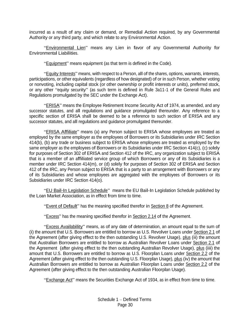 Schedule 1 – Defined Terms Page 30 incurred as a result of any claim or demand, or Remedial Action required, by any Governmental Authority or any third party, and which relate to any Environmental Action. “Environmental Lien” means any Lien in favor of any Governmental Authority for Environmental Liabilities. “Equipment” means equipment (as that term is defined in the Code). “Equity Interests” means, with respect to a Person, all of the shares, options, warrants, interests, participations, or other equivalents (regardless of how designated) of or in such Person, whether voting or nonvoting, including capital stock (or other ownership or profit interests or units), preferred stock, or any other “equity security” (as such term is defined in Rule 3a11-1 of the General Rules and Regulations promulgated by the SEC under the Exchange Act). “ERISA” means the Employee Retirement Income Security Act of 1974, as amended, and any successor statutes, and all regulations and guidance promulgated thereunder. Any reference to a specific section of ERISA shall be deemed to be a reference to such section of ERISA and any successor statutes, and all regulations and guidance promulgated thereunder. “ERISA Affiliate” means (a) any Person subject to ERISA whose employees are treated as employed by the same employer as the employees of Borrowers or its Subsidiaries under IRC Section 414(b), (b) any trade or business subject to ERISA whose employees are treated as employed by the same employer as the employees of Borrowers or its Subsidiaries under IRC Section 414(c), (c) solely for purposes of Section 302 of ERISA and Section 412 of the IRC, any organization subject to ERISA that is a member of an affiliated service group of which Borrowers or any of its Subsidiaries is a member under IRC Section 414(m), or (d) solely for purposes of Section 302 of ERISA and Section 412 of the IRC, any Person subject to ERISA that is a party to an arrangement with Borrowers or any of its Subsidiaries and whose employees are aggregated with the employees of Borrowers or its Subsidiaries under IRC Section 414(o). “EU Bail-In Legislation Schedule” means the EU Bail-In Legislation Schedule published by the Loan Market Association, as in effect from time to time. “Event of Default” has the meaning specified therefor in Section 8 of the Agreement. “Excess” has the meaning specified therefor in Section 2.14 of the Agreement. “Excess Availability” means, as of any date of determination, an amount equal to the sum of (i) the amount that U.S. Borrowers are entitled to borrow as U.S. Revolver Loans under Section 2.1 of the Agreement (after giving effect to the then outstanding U.S. Revolver Usage), plus (ii) the amount that Australian Borrowers are entitled to borrow as Australian Revolver Loans under Section 2.1 of the Agreement (after giving effect to the then outstanding Australian Revolver Usage), plus (iii) the amount that U.S. Borrowers are entitled to borrow as U.S. Floorplan Loans under Section 2.2 of the Agreement (after giving effect to the then outstanding U.S. Floorplan Usage), plus (iv) the amount that Australian Borrowers are entitled to borrow as Australian Floorplan Loans under Section 2.2 of the Agreement (after giving effect to the then outstanding Australian Floorplan Usage). “Exchange Act” means the Securities Exchange Act of 1934, as in effect from time to time.