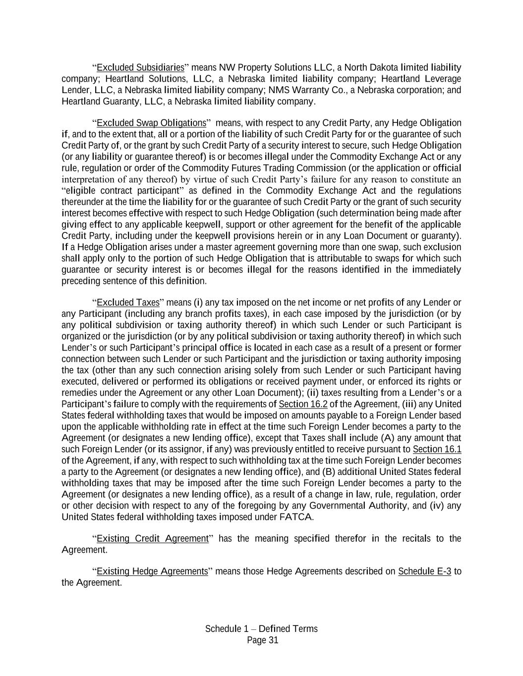 Schedule 1 – Defined Terms Page 31 “Excluded Subsidiaries” means NW Property Solutions LLC, a North Dakota limited liability company; Heartland Solutions, LLC, a Nebraska limited liability company; Heartland Leverage Lender, LLC, a Nebraska limited liability company; NMS Warranty Co., a Nebraska corporation; and Heartland Guaranty, LLC, a Nebraska limited liability company. “Excluded Swap Obligations” means, with respect to any Credit Party, any Hedge Obligation if, and to the extent that, all or a portion of the liability of such Credit Party for or the guarantee of such Credit Party of, or the grant by such Credit Party of a security interest to secure, such Hedge Obligation (or any liability or guarantee thereof) is or becomes illegal under the Commodity Exchange Act or any rule, regulation or order of the Commodity Futures Trading Commission (or the application or official interpretation of any thereof) by virtue of such Credit Party’s failure for any reason to constitute an “eligible contract participant” as defined in the Commodity Exchange Act and the regulations thereunder at the time the liability for or the guarantee of such Credit Party or the grant of such security interest becomes effective with respect to such Hedge Obligation (such determination being made after giving effect to any applicable keepwell, support or other agreement for the benefit of the applicable Credit Party, including under the keepwell provisions herein or in any Loan Document or guaranty). If a Hedge Obligation arises under a master agreement governing more than one swap, such exclusion shall apply only to the portion of such Hedge Obligation that is attributable to swaps for which such guarantee or security interest is or becomes illegal for the reasons identified in the immediately preceding sentence of this definition. “Excluded Taxes” means (i) any tax imposed on the net income or net profits of any Lender or any Participant (including any branch profits taxes), in each case imposed by the jurisdiction (or by any political subdivision or taxing authority thereof) in which such Lender or such Participant is organized or the jurisdiction (or by any political subdivision or taxing authority thereof) in which such Lender’s or such Participant’s principal office is located in each case as a result of a present or former connection between such Lender or such Participant and the jurisdiction or taxing authority imposing the tax (other than any such connection arising solely from such Lender or such Participant having executed, delivered or performed its obligations or received payment under, or enforced its rights or remedies under the Agreement or any other Loan Document); (ii) taxes resulting from a Lender’s or a Participant’s failure to comply with the requirements of Section 16.2 of the Agreement, (iii) any United States federal withholding taxes that would be imposed on amounts payable to a Foreign Lender based upon the applicable withholding rate in effect at the time such Foreign Lender becomes a party to the Agreement (or designates a new lending office), except that Taxes shall include (A) any amount that such Foreign Lender (or its assignor, if any) was previously entitled to receive pursuant to Section 16.1 of the Agreement, if any, with respect to such withholding tax at the time such Foreign Lender becomes a party to the Agreement (or designates a new lending office), and (B) additional United States federal withholding taxes that may be imposed after the time such Foreign Lender becomes a party to the Agreement (or designates a new lending office), as a result of a change in law, rule, regulation, order or other decision with respect to any of the foregoing by any Governmental Authority, and (iv) any United States federal withholding taxes imposed under FATCA. “Existing Credit Agreement” has the meaning specified therefor in the recitals to the Agreement. “Existing Hedge Agreements” means those Hedge Agreements described on Schedule E-3 to the Agreement.