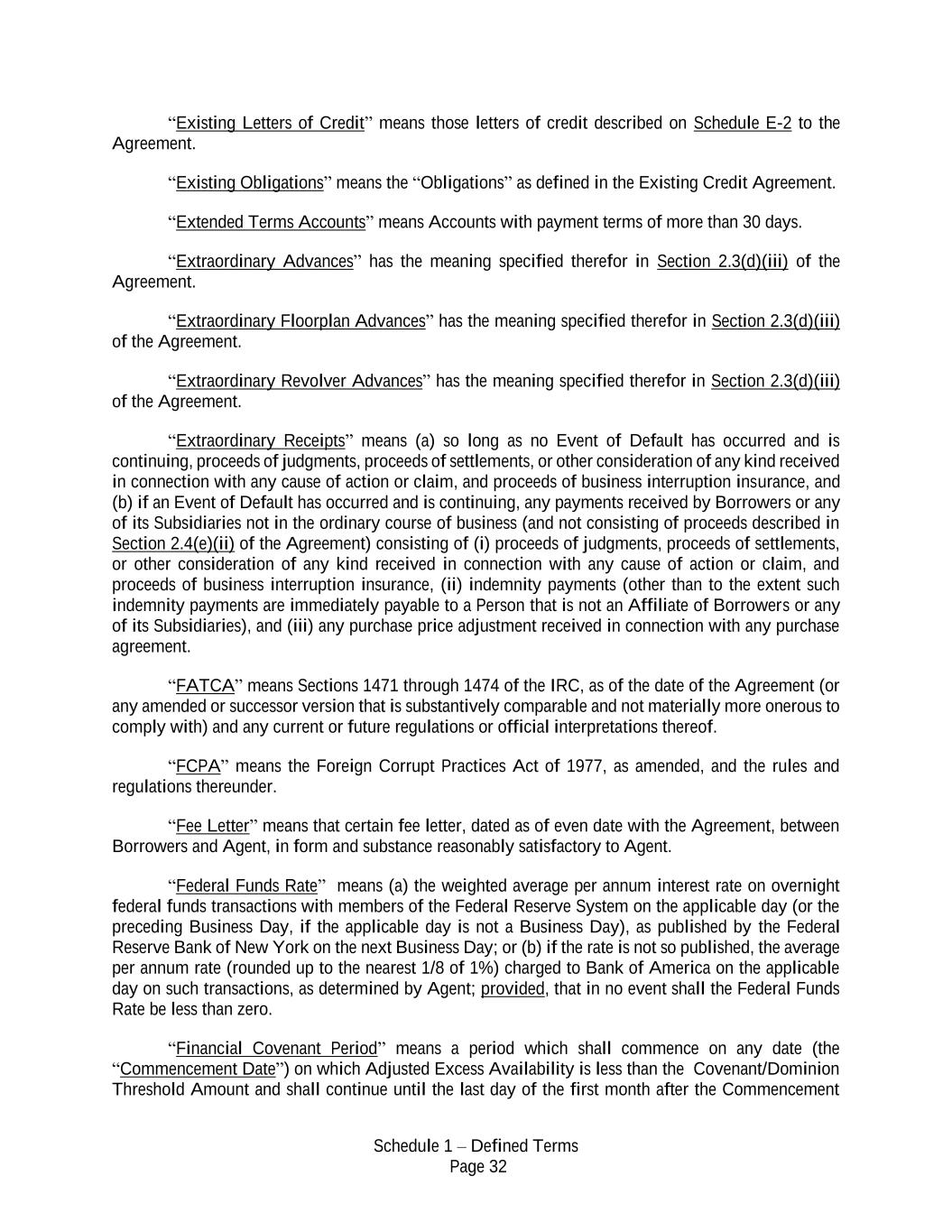 Schedule 1 – Defined Terms Page 32 “Existing Letters of Credit” means those letters of credit described on Schedule E-2 to the Agreement. “Existing Obligations” means the “Obligations” as defined in the Existing Credit Agreement. “Extended Terms Accounts” means Accounts with payment terms of more than 30 days. “Extraordinary Advances” has the meaning specified therefor in Section 2.3(d)(iii) of the Agreement. “Extraordinary Floorplan Advances” has the meaning specified therefor in Section 2.3(d)(iii) of the Agreement. “Extraordinary Revolver Advances” has the meaning specified therefor in Section 2.3(d)(iii) of the Agreement. “Extraordinary Receipts” means (a) so long as no Event of Default has occurred and is continuing, proceeds of judgments, proceeds of settlements, or other consideration of any kind received in connection with any cause of action or claim, and proceeds of business interruption insurance, and (b) if an Event of Default has occurred and is continuing, any payments received by Borrowers or any of its Subsidiaries not in the ordinary course of business (and not consisting of proceeds described in Section 2.4(e)(ii) of the Agreement) consisting of (i) proceeds of judgments, proceeds of settlements, or other consideration of any kind received in connection with any cause of action or claim, and proceeds of business interruption insurance, (ii) indemnity payments (other than to the extent such indemnity payments are immediately payable to a Person that is not an Affiliate of Borrowers or any of its Subsidiaries), and (iii) any purchase price adjustment received in connection with any purchase agreement. “FATCA” means Sections 1471 through 1474 of the IRC, as of the date of the Agreement (or any amended or successor version that is substantively comparable and not materially more onerous to comply with) and any current or future regulations or official interpretations thereof. “FCPA” means the Foreign Corrupt Practices Act of 1977, as amended, and the rules and regulations thereunder. “Fee Letter” means that certain fee letter, dated as of even date with the Agreement, between Borrowers and Agent, in form and substance reasonably satisfactory to Agent. “Federal Funds Rate” means (a) the weighted average per annum interest rate on overnight federal funds transactions with members of the Federal Reserve System on the applicable day (or the preceding Business Day, if the applicable day is not a Business Day), as published by the Federal Reserve Bank of New York on the next Business Day; or (b) if the rate is not so published, the average per annum rate (rounded up to the nearest 1/8 of 1%) charged to Bank of America on the applicable day on such transactions, as determined by Agent; provided, that in no event shall the Federal Funds Rate be less than zero. “Financial Covenant Period” means a period which shall commence on any date (the “Commencement Date”) on which Adjusted Excess Availability is less than the Covenant/Dominion Threshold Amount and shall continue until the last day of the first month after the Commencement