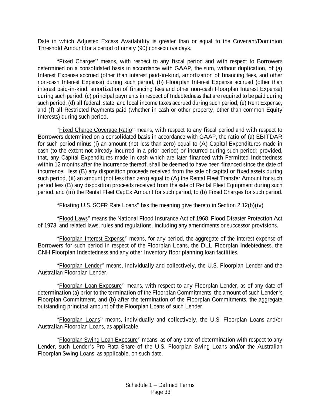Schedule 1 – Defined Terms Page 33 Date in which Adjusted Excess Availability is greater than or equal to the Covenant/Dominion Threshold Amount for a period of ninety (90) consecutive days. “Fixed Charges” means, with respect to any fiscal period and with respect to Borrowers determined on a consolidated basis in accordance with GAAP, the sum, without duplication, of (a) Interest Expense accrued (other than interest paid-in-kind, amortization of financing fees, and other non-cash Interest Expense) during such period, (b) Floorplan Interest Expense accrued (other than interest paid-in-kind, amortization of financing fees and other non-cash Floorplan Interest Expense) during such period, (c) principal payments in respect of Indebtedness that are required to be paid during such period, (d) all federal, state, and local income taxes accrued during such period, (e) Rent Expense, and (f) all Restricted Payments paid (whether in cash or other property, other than common Equity Interests) during such period. “Fixed Charge Coverage Ratio” means, with respect to any fiscal period and with respect to Borrowers determined on a consolidated basis in accordance with GAAP, the ratio of (a) EBITDAR for such period minus (i) an amount (not less than zero) equal to (A) Capital Expenditures made in cash (to the extent not already incurred in a prior period) or incurred during such period; provided, that, any Capital Expenditures made in cash which are later financed with Permitted Indebtedness within 12 months after the incurrence thereof, shall be deemed to have been financed since the date of incurrence; less (B) any disposition proceeds received from the sale of capital or fixed assets during such period, (ii) an amount (not less than zero) equal to (A) the Rental Fleet Transfer Amount for such period less (B) any disposition proceeds received from the sale of Rental Fleet Equipment during such period, and (iii) the Rental Fleet CapEx Amount for such period, to (b) Fixed Charges for such period. “Floating U.S. SOFR Rate Loans” has the meaning give thereto in Section 2.12(b)(iv) “Flood Laws” means the National Flood Insurance Act of 1968, Flood Disaster Protection Act of 1973, and related laws, rules and regulations, including any amendments or successor provisions. “Floorplan Interest Expense” means, for any period, the aggregate of the interest expense of Borrowers for such period in respect of the Floorplan Loans, the DLL Floorplan Indebtedness, the CNH Floorplan Indebtedness and any other Inventory floor planning loan facilities. “Floorplan Lender” means, individually and collectively, the U.S. Floorplan Lender and the Australian Floorplan Lender. “Floorplan Loan Exposure” means, with respect to any Floorplan Lender, as of any date of determination (a) prior to the termination of the Floorplan Commitments, the amount of such Lender’s Floorplan Commitment, and (b) after the termination of the Floorplan Commitments, the aggregate outstanding principal amount of the Floorplan Loans of such Lender. “Floorplan Loans” means, individually and collectively, the U.S. Floorplan Loans and/or Australian Floorplan Loans, as applicable. “Floorplan Swing Loan Exposure” means, as of any date of determination with respect to any Lender, such Lender’s Pro Rata Share of the U.S. Floorplan Swing Loans and/or the Australian Floorplan Swing Loans, as applicable, on such date.