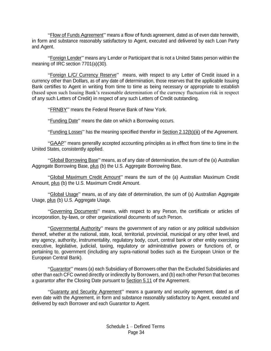 Schedule 1 – Defined Terms Page 34 “Flow of Funds Agreement” means a flow of funds agreement, dated as of even date herewith, in form and substance reasonably satisfactory to Agent, executed and delivered by each Loan Party and Agent. “Foreign Lender” means any Lender or Participant that is not a United States person within the meaning of IRC section 7701(a)(30). “Foreign L/C/ Currency Reserve” means, with respect to any Letter of Credit issued in a currency other than Dollars, as of any date of determination, those reserves that the applicable Issuing Bank certifies to Agent in writing from time to time as being necessary or appropriate to establish (based upon such Issuing Bank’s reasonable determination of the currency fluctuation risk in respect of any such Letters of Credit) in respect of any such Letters of Credit outstanding. “FRNBY” means the Federal Reserve Bank of New York. “Funding Date” means the date on which a Borrowing occurs. “Funding Losses” has the meaning specified therefor in Section 2.12(b)(ii) of the Agreement. “GAAP” means generally accepted accounting principles as in effect from time to time in the United States, consistently applied. “Global Borrowing Base” means, as of any date of determination, the sum of the (a) Australian Aggregate Borrowing Base, plus (b) the U.S. Aggregate Borrowing Base. “Global Maximum Credit Amount” means the sum of the (a) Australian Maximum Credit Amount, plus (b) the U.S. Maximum Credit Amount. “Global Usage” means, as of any date of determination, the sum of (a) Australian Aggregate Usage, plus (b) U.S. Aggregate Usage. “Governing Documents” means, with respect to any Person, the certificate or articles of incorporation, by-laws, or other organizational documents of such Person. “Governmental Authority” means the government of any nation or any political subdivision thereof, whether at the national, state, local, territorial, provincial, municipal or any other level, and any agency, authority, instrumentality, regulatory body, court, central bank or other entity exercising executive, legislative, judicial, taxing, regulatory or administrative powers or functions of, or pertaining to, government (including any supra-national bodies such as the European Union or the European Central Bank). “Guarantor” means (a) each Subsidiary of Borrowers other than the Excluded Subsidiaries and other than each CFC owned directly or indirectly by Borrowers, and (b) each other Person that becomes a guarantor after the Closing Date pursuant to Section 5.11 of the Agreement. “Guaranty and Security Agreement” means a guaranty and security agreement, dated as of even date with the Agreement, in form and substance reasonably satisfactory to Agent, executed and delivered by each Borrower and each Guarantor to Agent.