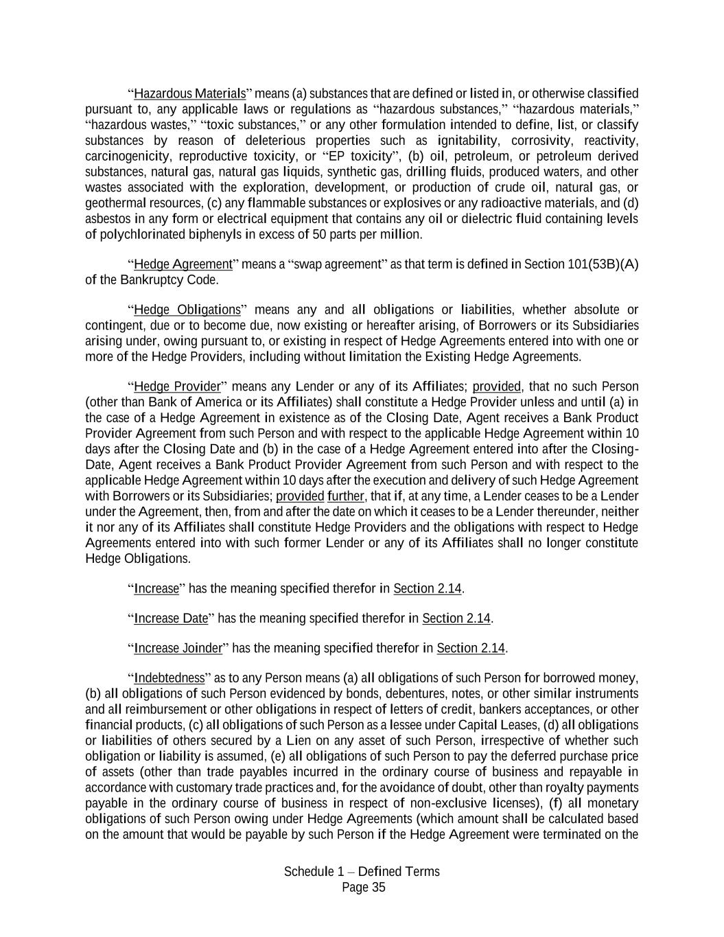 Schedule 1 – Defined Terms Page 35 “Hazardous Materials” means (a) substances that are defined or listed in, or otherwise classified pursuant to, any applicable laws or regulations as “hazardous substances,” “hazardous materials,” “hazardous wastes,” “toxic substances,” or any other formulation intended to define, list, or classify substances by reason of deleterious properties such as ignitability, corrosivity, reactivity, carcinogenicity, reproductive toxicity, or “EP toxicity”, (b) oil, petroleum, or petroleum derived substances, natural gas, natural gas liquids, synthetic gas, drilling fluids, produced waters, and other wastes associated with the exploration, development, or production of crude oil, natural gas, or geothermal resources, (c) any flammable substances or explosives or any radioactive materials, and (d) asbestos in any form or electrical equipment that contains any oil or dielectric fluid containing levels of polychlorinated biphenyls in excess of 50 parts per million. “Hedge Agreement” means a “swap agreement” as that term is defined in Section 101(53B)(A) of the Bankruptcy Code. “Hedge Obligations” means any and all obligations or liabilities, whether absolute or contingent, due or to become due, now existing or hereafter arising, of Borrowers or its Subsidiaries arising under, owing pursuant to, or existing in respect of Hedge Agreements entered into with one or more of the Hedge Providers, including without limitation the Existing Hedge Agreements. “Hedge Provider” means any Lender or any of its Affiliates; provided, that no such Person (other than Bank of America or its Affiliates) shall constitute a Hedge Provider unless and until (a) in the case of a Hedge Agreement in existence as of the Closing Date, Agent receives a Bank Product Provider Agreement from such Person and with respect to the applicable Hedge Agreement within 10 days after the Closing Date and (b) in the case of a Hedge Agreement entered into after the Closing- Date, Agent receives a Bank Product Provider Agreement from such Person and with respect to the applicable Hedge Agreement within 10 days after the execution and delivery of such Hedge Agreement with Borrowers or its Subsidiaries; provided further, that if, at any time, a Lender ceases to be a Lender under the Agreement, then, from and after the date on which it ceases to be a Lender thereunder, neither it nor any of its Affiliates shall constitute Hedge Providers and the obligations with respect to Hedge Agreements entered into with such former Lender or any of its Affiliates shall no longer constitute Hedge Obligations. “Increase” has the meaning specified therefor in Section 2.14. “Increase Date” has the meaning specified therefor in Section 2.14. “Increase Joinder” has the meaning specified therefor in Section 2.14. “Indebtedness” as to any Person means (a) all obligations of such Person for borrowed money, (b) all obligations of such Person evidenced by bonds, debentures, notes, or other similar instruments and all reimbursement or other obligations in respect of letters of credit, bankers acceptances, or other financial products, (c) all obligations of such Person as a lessee under Capital Leases, (d) all obligations or liabilities of others secured by a Lien on any asset of such Person, irrespective of whether such obligation or liability is assumed, (e) all obligations of such Person to pay the deferred purchase price of assets (other than trade payables incurred in the ordinary course of business and repayable in accordance with customary trade practices and, for the avoidance of doubt, other than royalty payments payable in the ordinary course of business in respect of non-exclusive licenses), (f) all monetary obligations of such Person owing under Hedge Agreements (which amount shall be calculated based on the amount that would be payable by such Person if the Hedge Agreement were terminated on the